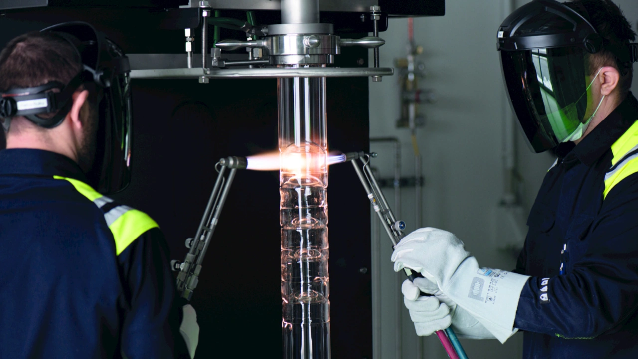 Der in Japan entwickelte »Feuertanz« ist für die Kristallzüchter Schwerstarbeit. Essenziell sind die Hitze des Gases, der Abstand der Flamme zum Glas und höchste Konzentration für ein gleichmäßiges Arbeiten im Takt mit dem Gegenüber. Es geht darum, während der folgenden Cadmium-Tellurid-Synthese das Glas nicht zu stressen und ein Bersten zu verhindern. Denn die aufwendige Präparation der Ampullen dient ausschließlich der Zuchtvorbereitung. Erst dann schützt der kohlenstoffbeschichtete Quarzbehälter die beiden Ausgangsstoffe vor Sauerstoff und Anhaftung – der Cadmiumtellurid-Ingot kann in reinster Qualität wachsen.