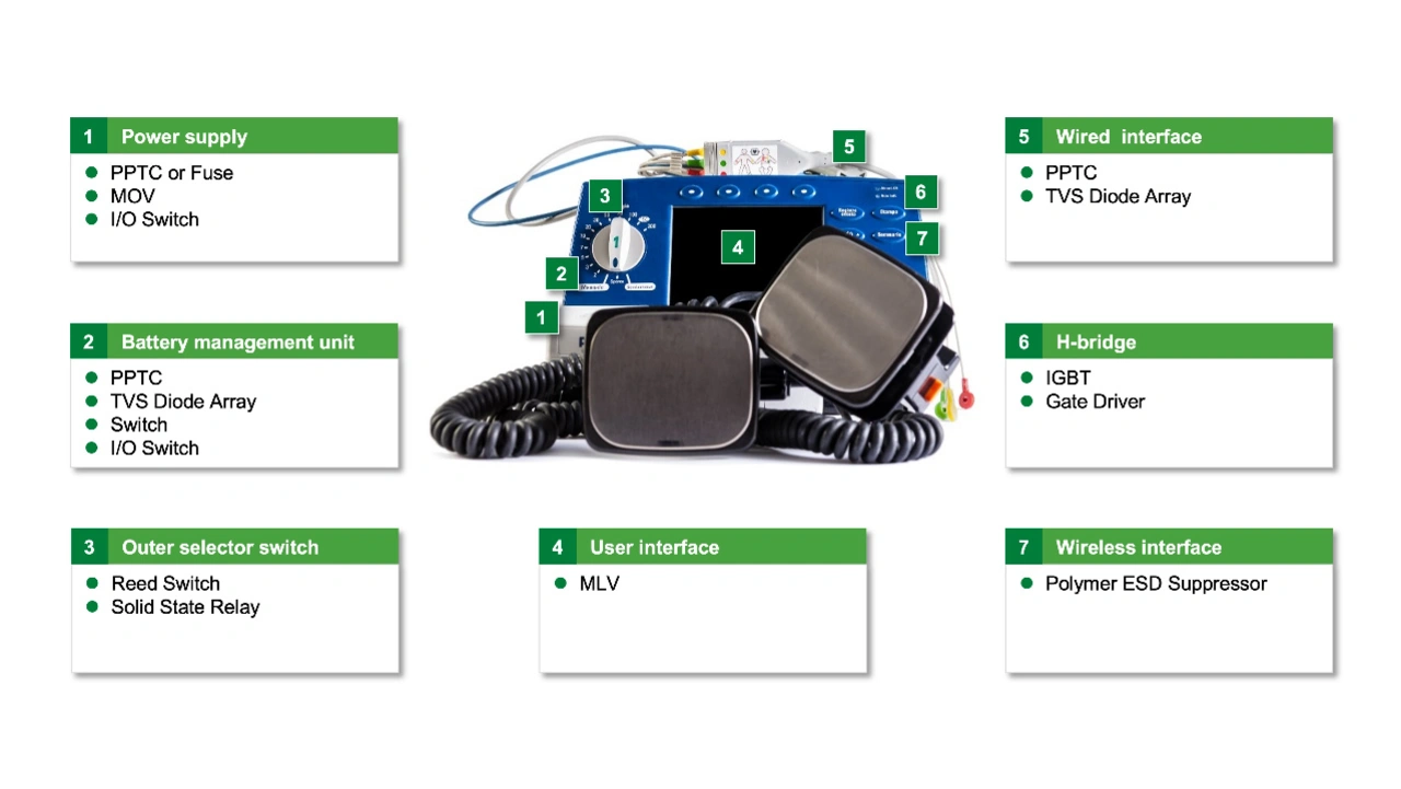 Aktuelle Defibrillatoren verfügen häufig über einen Anschluss für die drahtlose Kommunikation zur Übertragung des EKGs des Patienten an einen Arzt. Entwickler können diesen Anschluss mit oberflächenmontierten polymeren ESD-Unterdrückern schützen. Mit der Fähigkeit, eine Entladung von 15 kV durch die Luft zu absorbieren, und einer Reaktionszeit von unter 1 ns schützt der ESD-Suppressor einen Kommunikationsanschluss mit hoher Datenrate vollständig. ESD-Unterdrücker mit einer Kapazität von weniger als 1 pF und einem Leckstrom von weniger als 1 nA haben nur minimale Auswirkungen auf das vom Kommunikationsport verwendete Protokoll mit hoher Datenrate. Darüber hinaus kann der Entwickler diese Komponenten in 0402 (0,5 mm x 1 mm) oberflächenmontierten Gehäusen einsetzen, um so wenig Platz wie möglich auf der Leiterplatte des Schaltungsblocks zu verbrauchen.