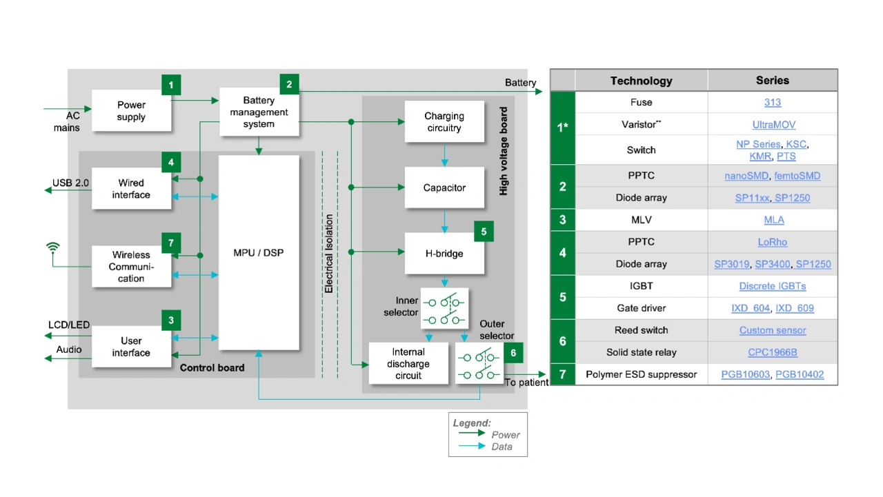 Dazu erzeugen Defibrillatoren hohe Stromstöße, um den Herzmuskel zu re-synchronisieren und den normalen Herzrhythmus wiederherzustellen, so dass das Blut effektiv durch den Körper gepumpt werden kann. Defibrillatoren können Millisekunden-Impulse von bis zu 360 J bei 1000 V und bis zu 30 A liefern. Bei diesen hohen Ausgangsleistungen sind Schutz- und Steuerungskomponenten für die Gewährleistung der Defibrillatorleistung sehr wichtig. Bild 1 stellt einen Beispiel-Defibrillator mit potenziellen Schutz-, Steuerungs- und Sensorkomponenten dar. Bild 2 zeigt ein Blockdiagramm für einen Defibrillator und eine Tabelle, in der die möglichen Komponenten für die Schaltkreisblöcke aufgeführt sind, die Schutz-, Steuerungs- und Sicherheitssensoren erfordern.