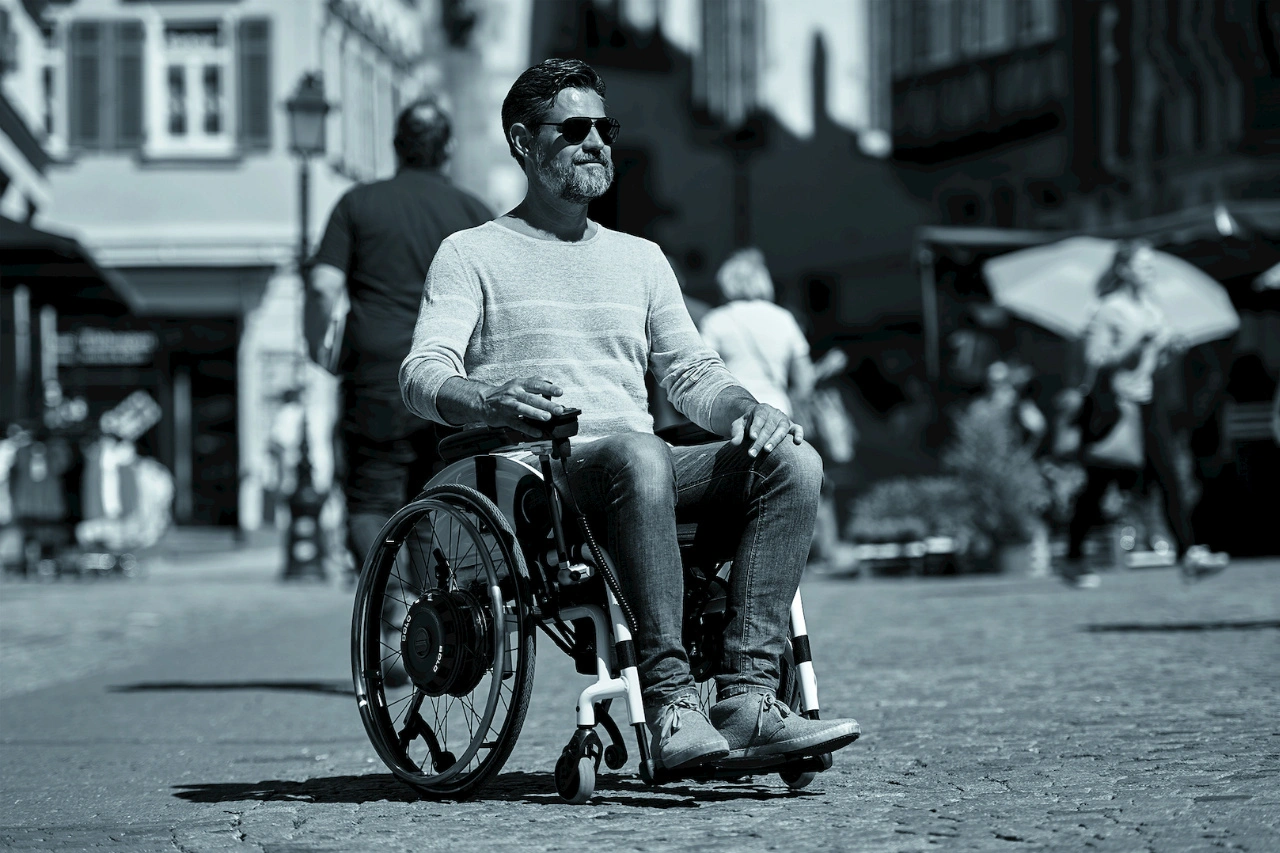 Die Rollstuhlfahrenden können ihr wendiges Fahrzeug über ein Steuerelement einfach bedienen. Leistungsstarke Motoren sind dezent in die Räder integriert (Bild 1), in Verbindung mit einem neu entwickelten Akku-Pack in Lithium-Ionen-Technik sorgen sie für eine Reichweite von bis zu 35 Kilometern. Ein neuartiges Aufnahme- und Verriegelungssystem der Antriebsräder ohne Steckachsen sorgt zudem für eine einfache Umrüstung und mehr Flexibilität.