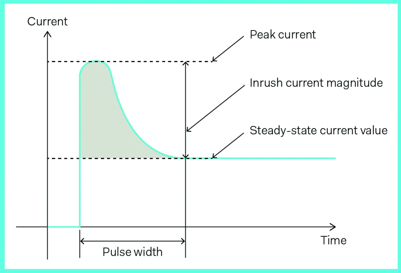Wenn die Ausgangsleistung einen definierten Grenzwert überschreitet, können verschiedene Schäden innerhalb der Stromversorgung oder in den zu versorgenden Geräten auftreten. Die Schutzschaltung (OCP) verhindert nicht nur, dass der Strom den Nennwert überschreitet, sondern begrenzt auch einen möglichen Kurzschlussstrom. Je nach Anwendung und spezifischen Systemanforderungen kann die Aktivierung der OCP verschiedene Auswirkungen haben: Der Ausgang kann mit einer manuellen Rückstellung dauerhaft abgeschaltet werden, mit einer automatischen Rückstellung vorübergehend abgeschaltet werden oder sich als fester, aber sicherer Konstantstrom verhalten (Bild 2). Wird das medizinische Gerät eingeschaltet, fließt ein hoher Anfangsstrom in die Last, der bei Null beginnt und bis zum Erreichen des Spitzenwertes ansteigt. Während dieser Sequenz, wenn sich die Entkopplungs- und Glättungskondensatoren aufladen und die Geräte aus dem kalten Zustand kommen, steigt der Strom sehr schnell von Null auf den Spitzenstrom an und sinkt dann allmählich auf Dauerstromniveau (Bild 3). Während dieses Zeitraums muss das Netzteil genügend Energie liefern, um die Kondensatoren aufzuladen und die Last mit der erforderlichen Leistung zu versorgen, ohne dass der Überstromschutz (OCP) aktiviert wird und der Ausgang abgeschaltet wird. Außerdem können sich manche Lasten anfangs wie ein Kurzschluss verhalten; das Netzteil darf aber nicht in den Schutzmodus übergehen. Um dieser Startsequenz Rechnung zu tragen, sind Netzteile so ausgelegt, dass sie einen gewissen Überstrom zulassen, und es ist üblich, den OCP-Schwellenwert auf etwa 110 Prozent des maximalen Nennwerts festzulegen.