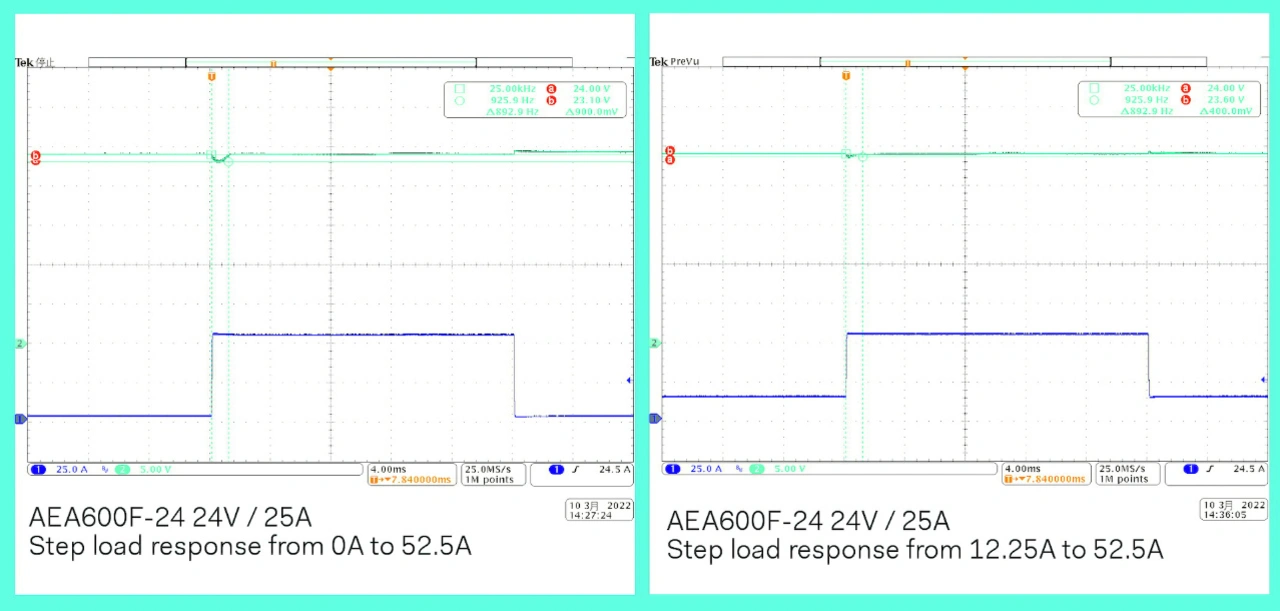 Als Referenz hierfür kann das Verhalten der Ausgangsspannung der AEA600F-Serie des Herstellers Cosel (Bild 5) dienen, wenn eine Spitzenlast an den Ausgang angelegt wird. Bei dem Produkt handelt es sich um ein 600-W-Netzteil, das 24 V bei einem Dauernennstrom von 25 A liefert. Wie in Bild 6 dargestellt, wurden die Stromversorgungseinheit und die Ausgangskondensatoren so ausgewählt, dass sie eine Spitzenleistung, die doppelt so hoch ist wie die Nennleistung, für eine Dauer von 1000 Millisekunden aufrechterhalten können. In Bild 6 sind zwei Zustände dargestellt: Laständerung von Leerlauf auf 52,5 A Spitze und von 12,5 A Halblast auf 52,5 A Spitze. In beiden Fällen bleibt die Spannung innerhalb der vorgegebenen Grenzen, und der Überstromschutz schaltet nicht ab.