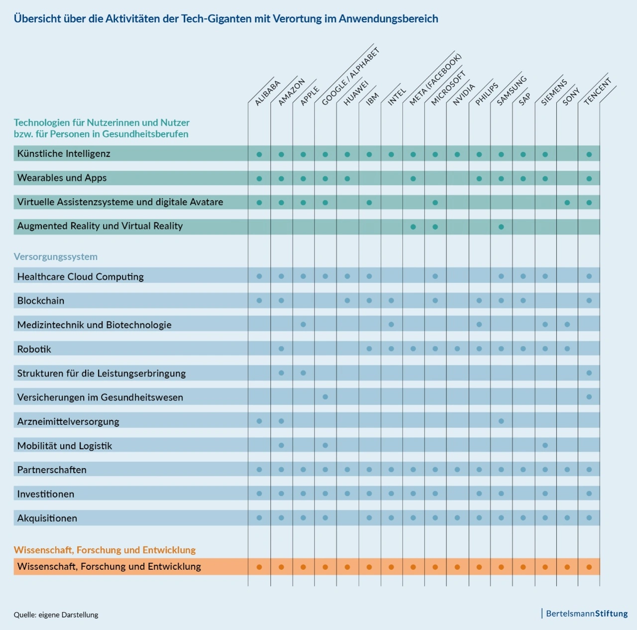 Von Amazon, Apple und Microsoft bis zu Samsung und Tencent: Die globalen Technologiekonzerne dringen immer stärker in den Gesundheitsbereich vor. Das zeigt eine Bestandsaufnahme des Forschungsteams unter Leitung der Ethikerin Christiane Woopen, das im Auftrag der Bertelsmann Stiftung das Angebot an medizinischen Produkten und Dienstleistungen von 16 der weltgrößten Digitalunternehmen untersucht hat. 13 davon waren Ende 2021 in der Rangliste der 100 wertvollsten Konzerne nach Börsenwert vertreten. Ihre Aktivitäten und Geschäftsfelder weisen eine enorme Bandbreite auf.