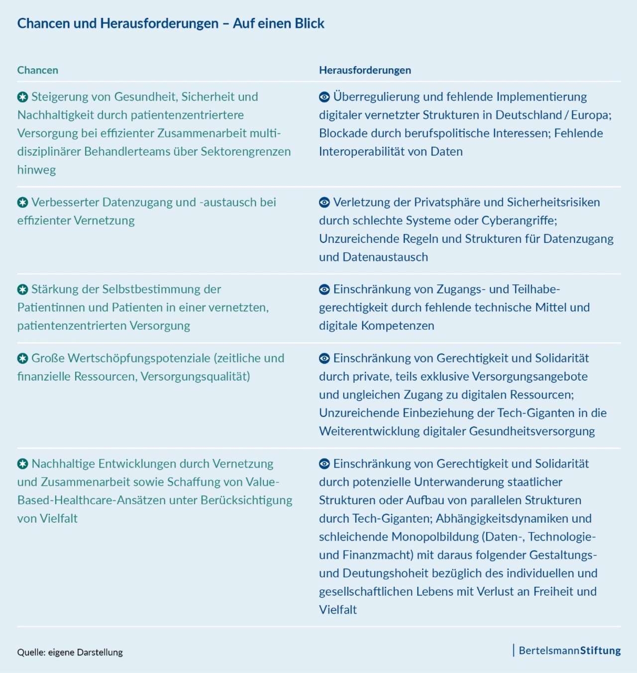 Expeerten empfehlen daher, dass die deutsche und europäische Gesundheitspolitik zunächst einen klaren regulativen Rahmen schaffen. Dieser müsste definieren, unter welchen Voraussetzungen und nach welchen Regeln Kooperationen mit Tech-Unternehmen möglich sind – und wie sich deren Innovationen nutzenbringend integrieren lassen. Flankiert werden sollte das durch eine gesellschaftliche Debatte, an welchen Werten und ethischen Leitplanken sich die digitale Transformation des Gesundheitswesens zu orientieren hat.
