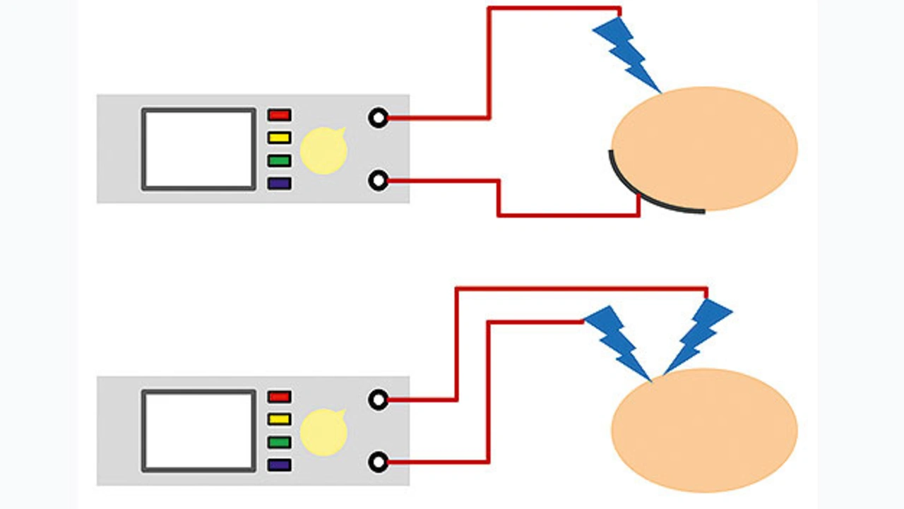 Unterhalb von 40 °C wird das Gewebe nicht beeinflusst; die wirksamen Temperaturen beginnen bei 60 °C zur Devitalisierung von Zellen wie z. B. Krebsgewebe. Schnitte werden mit 100 °C ausgeführt, und jenseits 150 °C wird das Gewebe karbonisiert und durch den Körper ausgeschieden. In der HF-Chirurgie wird zwischen monopolarem und bipolarem Betrieb (Bild 1) unterschieden. Dies bezieht sich auf die Ausführung der Elektrode und das Spannungspotenzial, dem der Patient ausgesetzt wird.