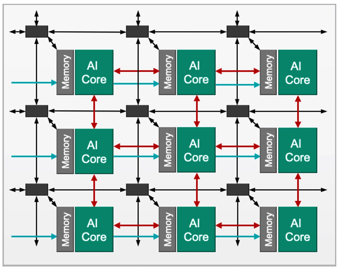 Die AIE ist die Hauptrecheneinheit für die ultraschnellen Algorithmen (wie Planar Wave und Synthetic Aperture). Es handelt sich um eine große Matrix von SIMD/VLIW-Prozessoren, die in einem Netz verbunden sind (siehe Bild 1). Jeder Prozessor hat seinen eigenen Befehls- und Datenspeicher und kann den Speicher mit seinen Nachbarn teilen. Alle Prozessoren sind über einen innovativen Interconnect mit einer enormen Bandbreite von mehreren TeraBytes pro Sekunde verbunden. Diese Struktur ermöglicht ein noch nie dagewesenes Maß an Parallelität, das für die Implementierung solcher Algorithmen erforderlich ist.
