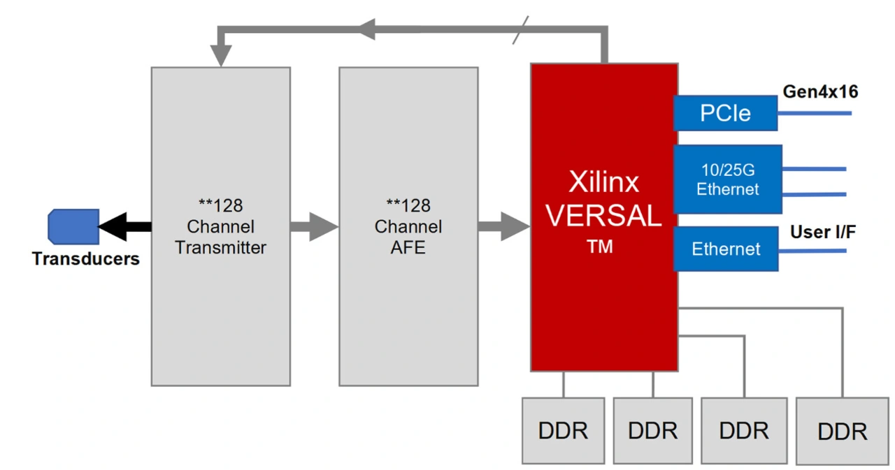 Der FPGA, der Teil des Bausteins ist, verwaltet die Wandler und erfasst die Echos, speichert die Daten in externen DDR4-Speichern und kann über einen PCIe-Anschluss mit dem Host-System kommunizieren oder über das Precision Time Protocol und 10/25-Gigabit-Ethernet-Kanäle mit einem anderen Modul erweitern und synchronisieren.