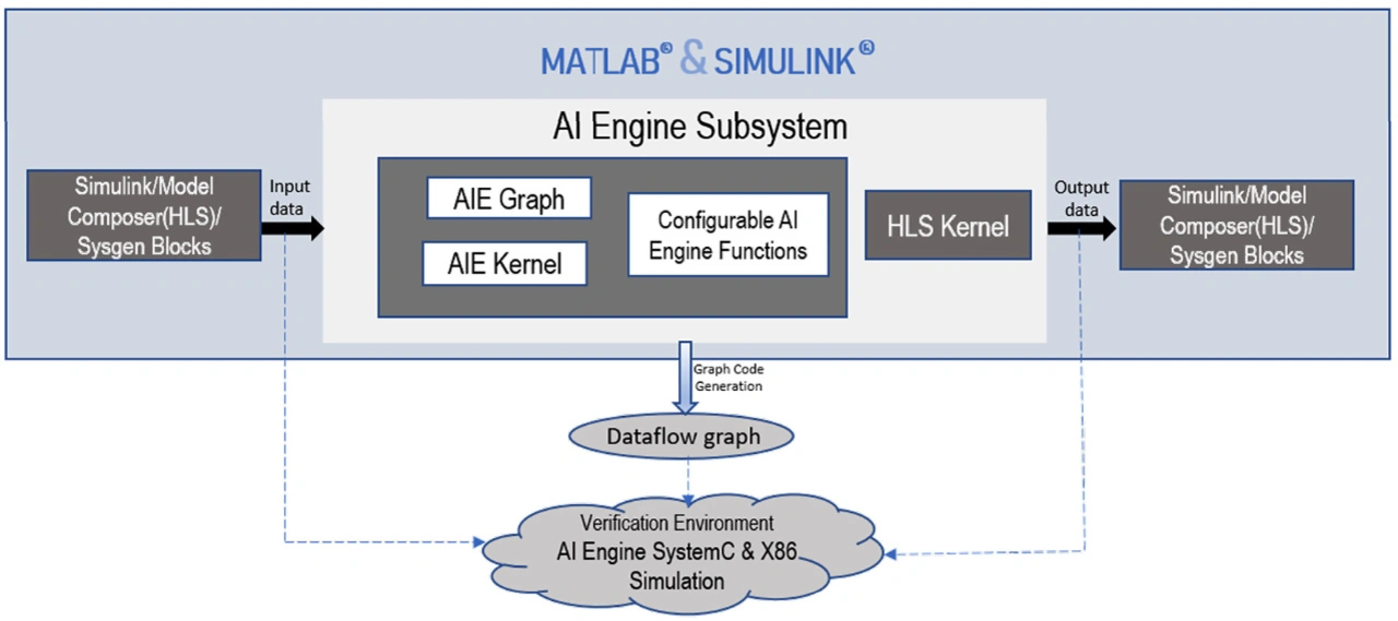 Matlab Support wird über den Model Composer angeboten, einem modellbasierten Design-Tool, das ein schnelles Design in der Matlab- und Simulink-Umgebung ermöglicht und den Weg zur Produktion von adaptiven Versal-SoC-Bauteilen durch automatische Codegenerierung beschleunigt. Dies wird durch eine Reihe von C++-Vorlagen verstärkt, die die grundlegende API der KI-Engines umhüllen (Bild 3).