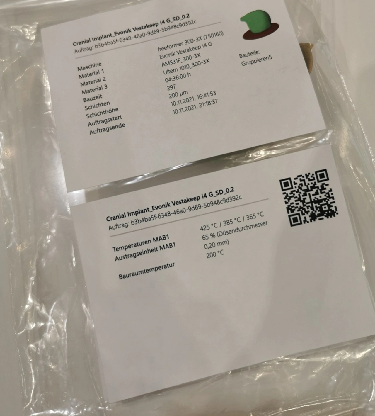 Über den QR-Code können in der App zusätzlich die aufgezeichneten Prozessdaten über die komplette Bauzeit eingesehen werden mit detaillierten Informationen zu Massedruck, Schneckenposition, Tropfenfrequenz und Austragsmenge. Die erfolgreiche und lückenlose Überwachung, teilespezifische Rückverfolgung und Dokumentation der Prozessdaten ist nicht nur für die Medizintechnik, sondern auch für die Bereiche Automotive sowie Luft- und Raumfahrt interessant.