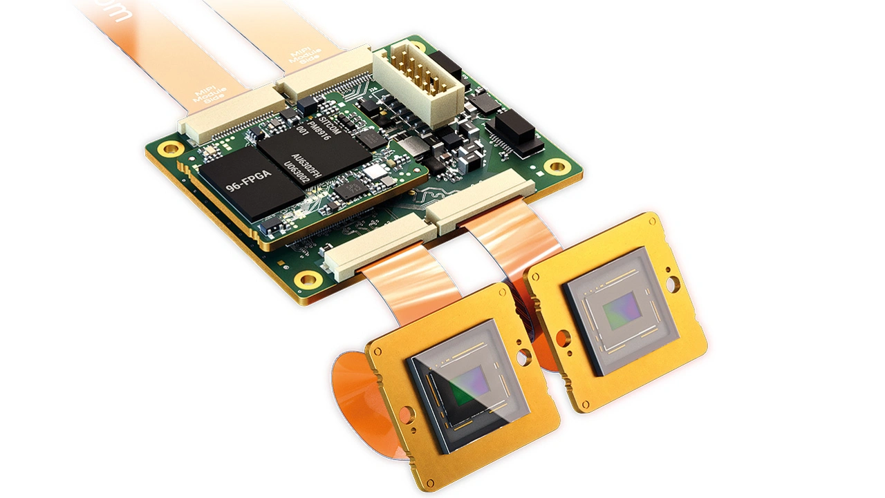 Die MIPI-CSI-2-Schnittstelle vereinfacht den Anschluss der Kameras: Sie wird von gängigen Prozessoren unterstützt und ermöglicht eine schnelle und effiziente Datenübertragung. Je nach Embedded-Prozessor werden über die MIPI-Schnittstelle bis zu vier Lanes je Kameraanschluss für den Datentransfer von der Kamera zum Prozessor unterstützt. Bei einer von gängigen CPU-Boards erreichbaren Verarbeitungs-geschwindigkeit von 1,5 Gbit/s sind entsprechend Übertragungsraten von 6 Gbit/s möglich. Bei 8 bit Pixelauflösung entspricht das ca. 750 MB/s. MIPI-Kameras eignen sich damit auch für Echtzeitanwendungen und datenintensives Streaming von Bild- und Videodaten. In der Regel erfolgt die Datenübertragung dabei über FPC-Kabel (Flexible Printed Circuits). Bei besonderen Anwendungsfällen – zum Beispiel bei Kabellängen von mehreren Metern – kann das Signal über spezielle Adapterboards gewandelt und per Coax- oder Glasfaserkabel übertragen werden.