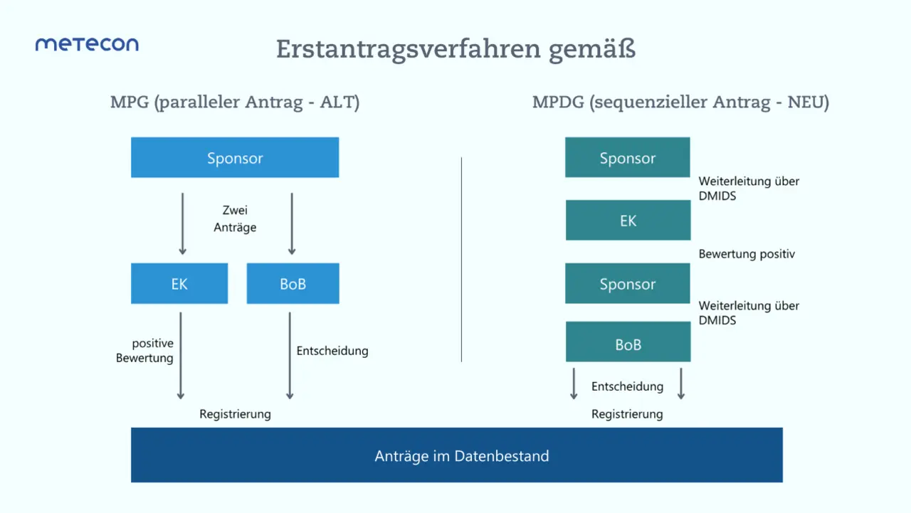 Ab sofort gilt ein sequentielles Verfahren, wonach die Anmeldung einer Leistungsstudie bei der BoB erst nach einem zustimmenden Votum der EK erfolgen darf (vgl. Bild 1). Erstantragsverfahren einer Leistungsprüfung nach MPG und MPDGDie genauen Fristen und Abläufe einer Leistungsstudie sowie Leistungsstudien mit therapiebegleitenden Diagnostika werden nach der Aktualisierung durch das MPEUAnpG in § 31a und 31b beschrieben.