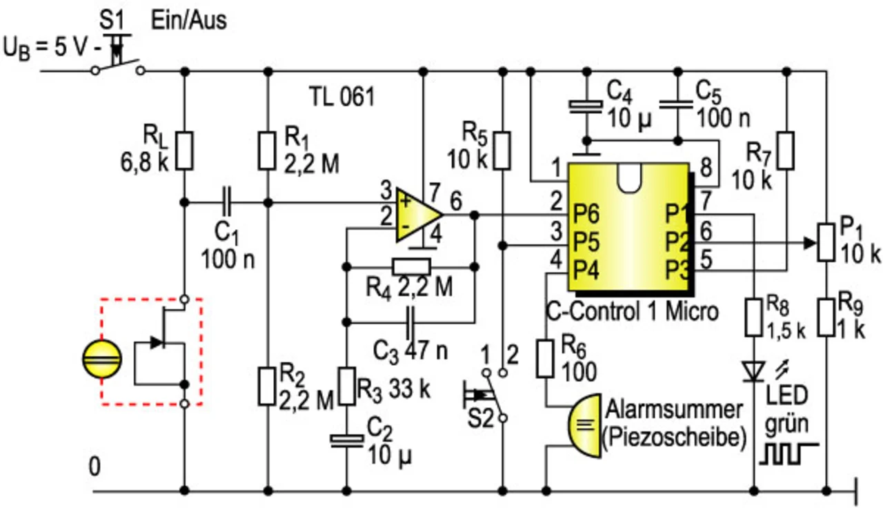 Intelligentere Lösungen lassen sich nur sinnvoll mit Mikroprozessoren realisieren. Bild 4 zeigt eine mit möglichst wenig Bauteilen realisierte Schaltung unter Verwendung des programmierbaren Prozessors Micro C-Control1 von Conrad Electronic [3]. Dieser Mikroprozessor hat vier A/D-Umsetzer integriert, einen unabhängigen Timer mit einer Taktzeit von 20 ms, wird in BASIC programmiert und ermöglicht deshalb ohne großen Aufwand die Realisierung einer brauchbaren intelligenten Auswertung. Nach dem Einschalten (S1) läuft eine fest eingestellte Verzögerungszeit ab, die durch eine blinkende LED angezeigt wird. Nach Ablauf der Einschaltverzögerung leuchtet die LED permanent und der Mikroprozessor ist bereit zur Signalauswertung. Mit dem Schalter S2 ist eine Vorwahl der Ansprechempfindlichkeit in zwei Stufen möglich – Detektionsentfernung kleiner oder größer 10 m. Mit P1 wird die Alarmdauer zwischen 10 s und 60 s eingestellt.