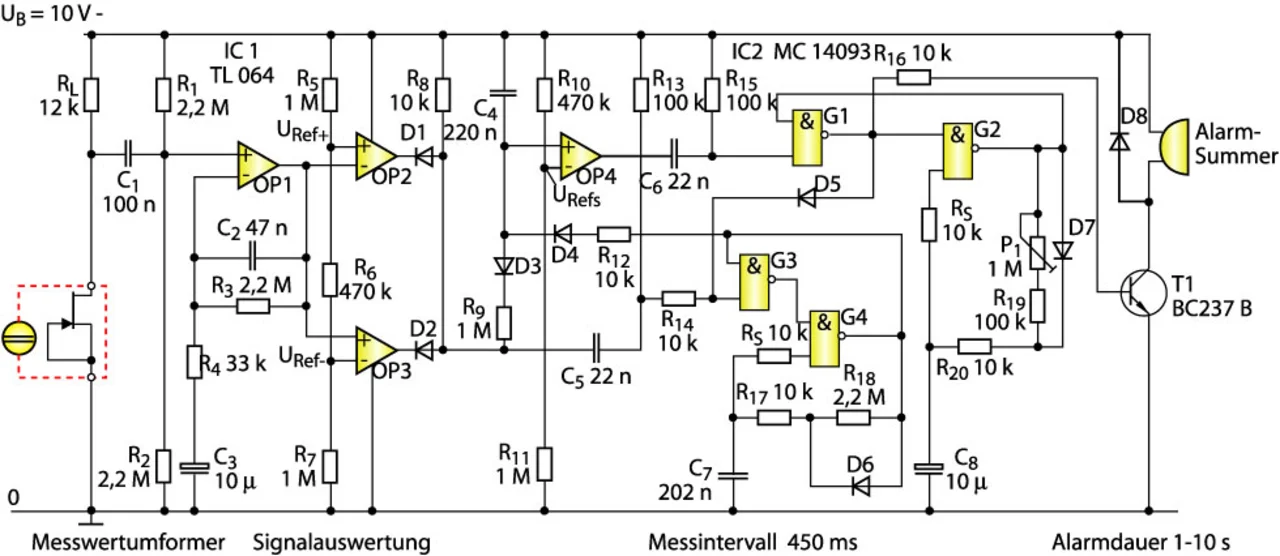 Wird die Spannung am Kondersator C4 innerhalb eines Messintervalls tD kleiner als URefs, schaltet OP4 auf „low“ und triggert mit seiner negativen Flanke die monostabile Kippstufe (G1 – G2) für die Alarmmeldung. Die Alarmdauer ta kann mit P1 kontinuierlich von 1 s bis 10 s einstellt werden. Nach Ablauf der Messzeit wird die Spannung an C4 wieder auf Null gesetzt und erst dann wieder zur Aufladung freigegeben, wenn die Signalamplitude URef– > Um > URef+ wird. Solange der Alarmausgang gesetzt ist, sperrt die Diode D5 den Start einer neuen Auswertung.