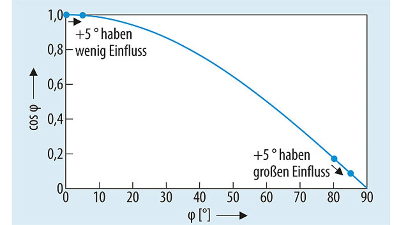 Warum das so ist, erklärt Bild 2. Bei sinusförmigen Spannungs- und Stromverläufen lässt sich die Wirkleistung aus P = U × I × cos φ berechnen. Mit U bzw. I und folglich der Scheinleistung S als fixer Größe, wird P nur noch durch cos φ bestimmt. In Bild 2 ist zu erkennen, dass eine Phasenwinkelabweichung von beispielsweise 5° bei einem Phasenwinkel von 0° nur wenig Einfluss (–0,38 %) auf die Größe der Wirkleistung P hat. Die gleiche Phasenwinkelabweichung von 5 ° bewirkt jedoch bei einem Phasenwinkel von 80° eine sehr große Änderung des Leistungswerts (–49,8 %), weil der Cosinus hier viel steiler verläuft.