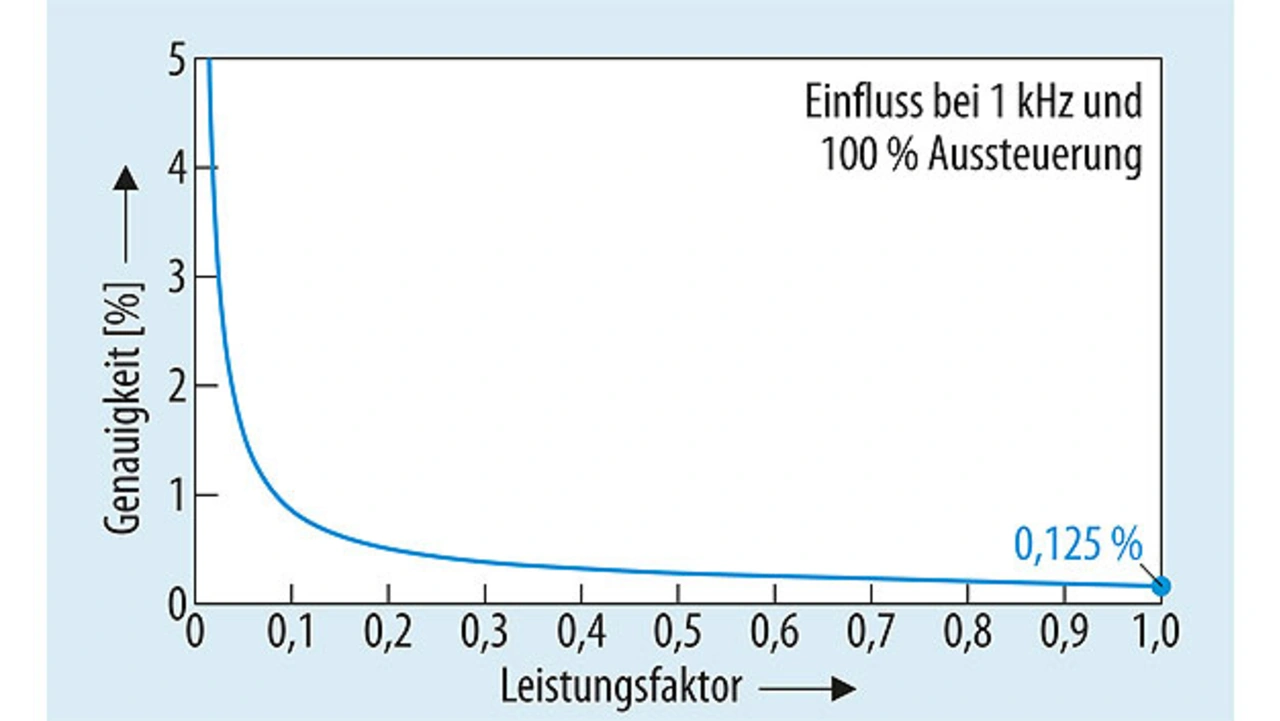 Der Einfluss des Leistungsfaktors cos φ auf die Leistungsmessgenauigkeit ist ein oft unterschätztes Phänomen. Die Ursache sind kleinste, unerwünschte Laufzeit- und Phasenwinkelabweichungen zwischen Spannungs- und Strompfad des Leistungsmessgeräts. Sie reduzieren die Genauigkeit der Wirkleistungsmessung bei Leistungsfaktoren kleiner als 1. Dieser Einfluss ist umso größer, je kleiner der Leistungsfaktor ist.