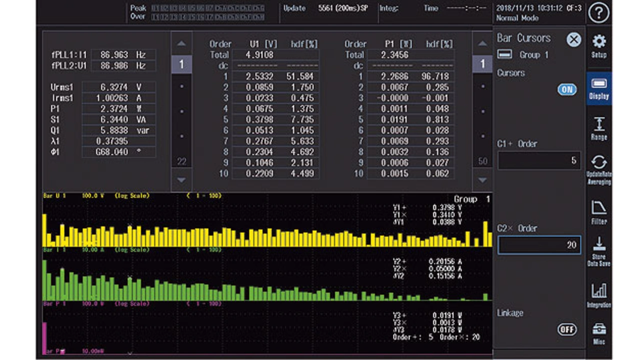 Die serienmäßigen dualen Harmonischen Analysen des WT5000 arbeiten mit Grundschwingungsfrequenzen von 0,1 Hz bis 300 kHz. »Dual« bedeutet, dass Analysen auf der Basis von zwei Grundschwingungsfrequenzen durchgeführt werden. Bei einer Grundschwingungsfrequenz von 15 kHz werden 17 verschiedene Messwerte bis zur 100. Ordnung für alle sieben Leistungselemente berechnet. Das ergibt 11.900 Messwerte für jedes Messintervall, sogar für Intervalle von nur 50 ms. Bis zu einer Grundschwingungsfrequenz von 3 kHz werden Analysen der sechs wichtigsten Messwerte sogar bis zur 500. Ordnung ermittelt. Zusammen sind es somit 11.900 + 16.800 = 28.700 Messwerte pro Intervall.
