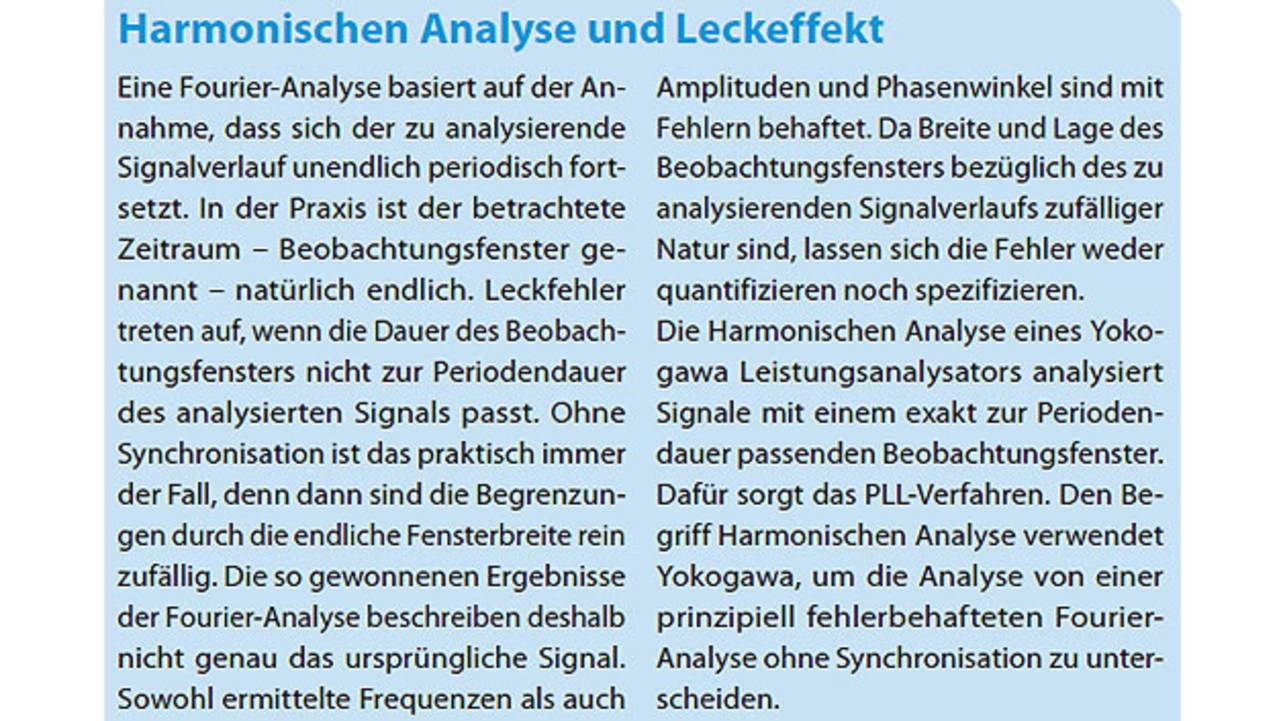 Yokogawa setzt für die Harmonischen Analyse bei allen Leistungsanalysatoren, auch beim neuen WT5000, das bewährte PLL-Verfahren ein. Es passt das rechteckige Beobachtungsfenster der Harmonischen Analyse mit Hilfe einer Phasenregelschleife an die jeweilige Grundschwingungsfrequenz an. Dadurch ist die Harmonischen Analyse frei von Leckeffekten (siehe Kasten: Harmonischen Analyse und Leckeffekt), die zu nicht quantifizierbaren Messfehlern führen würden. Dies ist eine Grundvoraussetzung dafür, dass Yokogawa die Genauigkeiten der wichtigsten Messwerte aus einer Harmonischen Analyse (Spannungen, Ströme, Wirkleistungen) spezifizieren kann (Bild 4).