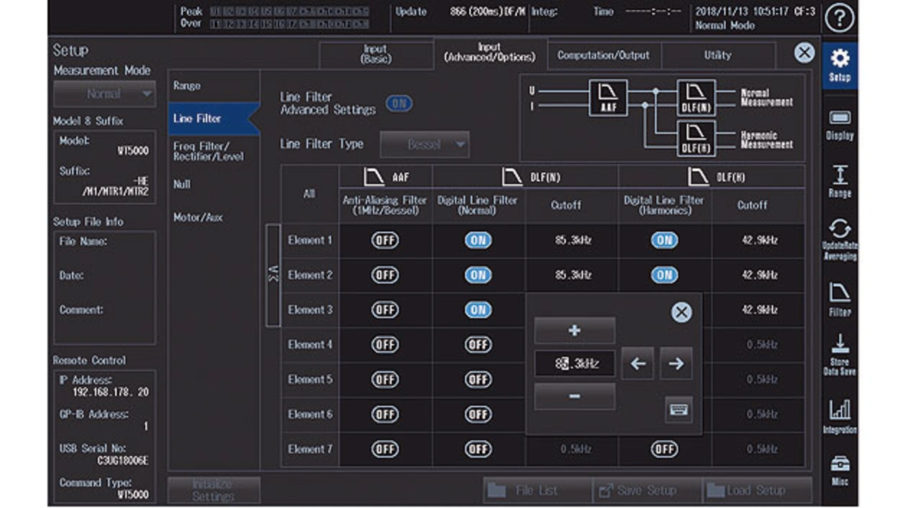 Komplexe Messaufgaben erfordern, dass breitbandige Leistungsmessungen und Harmonischen Analysen flexibel kombiniert werden können. Mit der neuen digitalen Parallelpfad-Technologie des WT5000 steht erstmalig ein Leistungsanalysator zur Verfügung, der sowohl Grundschwingungen als auch Oberschwingungen bis zur 500. Harmonischen vollkommen unabhängig von der breitbandigen Messung analysiert. Das bedeutet, dass auch die Line-Filter separat für die Parallelpfade der breitbandigen Messung und der Harmonischen Analyse eingestellt werden können. Dies ist in Bild 5 zu sehen. Die separaten Line-Filter für die Parallelpfade sind als digitale Filter realisiert. Dadurch gibt es weder Rückwirkungen auf den anderen Pfad noch irgendwelche anderen Einschränkungen. Jeder Pfad kann sehr einfach mit der gewünschten Bandbreite versehen werden.Die Charakteristika der Line-Filter sind wahlweise Butterworth oder Bessel vierter Ordnung. Für die Auswahl der Filtercharakteristik ist entscheidend, ob ein lineares Amplitudenverhalten oder ein günstiges Phasenverhalten im Vordergrund steht. Günstiges Phasenverhalten bedeutet, dass Signalanteile unterschiedlicher Frequenzen gleich verzögert werden.