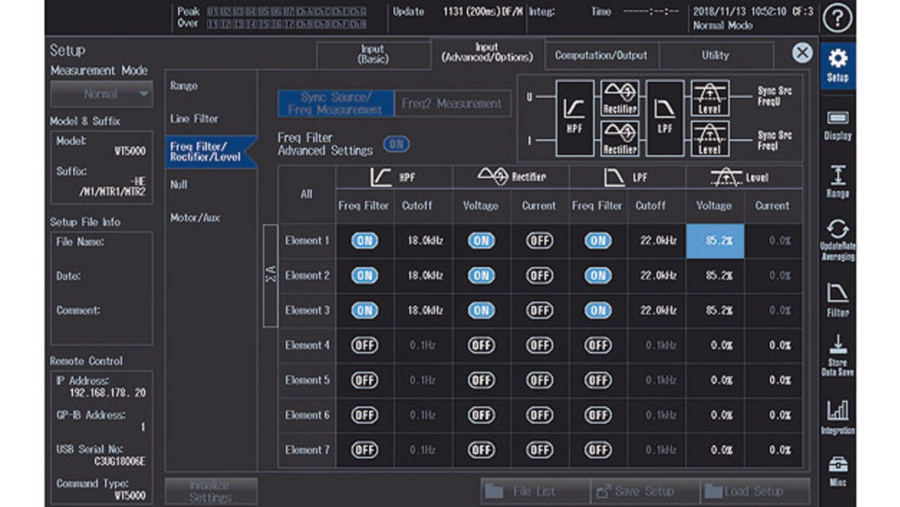 Insbesondere bei dem digitalen Mittelungsverfahren »Digital Filter Average« ist der Rechenaufwand enorm. In Echtzeit müssen aus den Abtastwerten der AD-Umsetzer die Leistungswerte inklusive der Maxima und Minima der Wirkleistung berechnet werden. Für Spannungen und Ströme liefert der Yokogawa WT5000 Gesamt-Effektivwerte (RMS), AC- und DC-Anteile, Gleichrichtwerte, größte und kleinste Amplitudenwerte sowie Scheitelfaktoren simultan für jedes Messintervall.