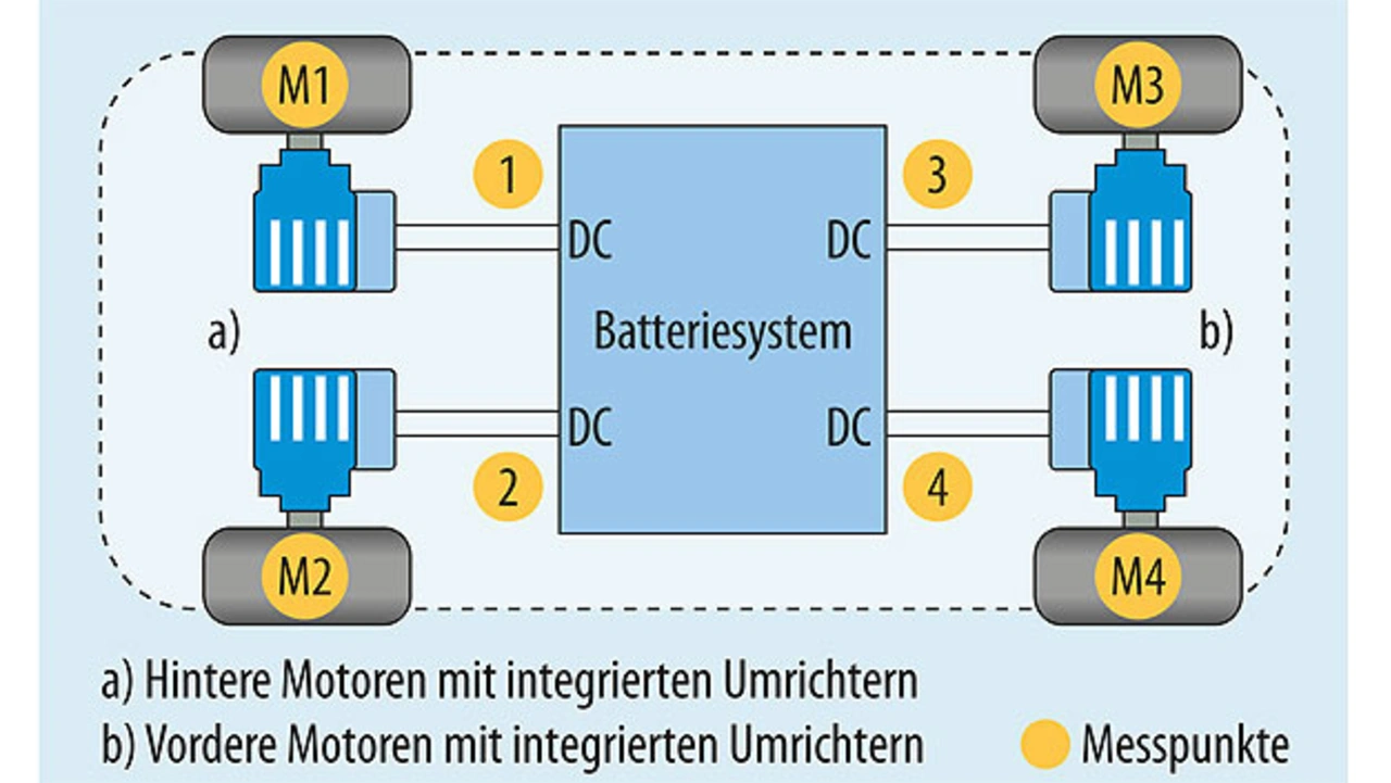 Bild 7 zeigt ein typisches Anwendungsbeispiel aus dem Automobilbereich. Für jeden der vier Radnabenantriebe sollen Eingangsleistung und abgegebene mechanische Leistung gemessen werden. Die Schnittstelle zwischen Umrichter und Motor ist aufgrund der kompakten Bauweise nicht zugänglich. Um diese Messaufgabe mit dem WT5000 zu lösen, werden vier Leistungselemente und die beiden Motor-Optionen benötigt. Hohe Welligkeit auf der Gleichspannung? Kein Problem, der WT5000 misst AC-, DC- und Gesamt-Effektivwert sowie größte und kleinste vorkommende Amplitudenwerte. Gleichzeitig bestimmt er die Wirkungsgrade der einzelnen Radnabenantriebe, die Achsen-bezogenen Wirkungsgrade sowie den Wirkungsgrad für das komplette Fahrzeug und misst die Frequenzen der Spannungswelligkeit.