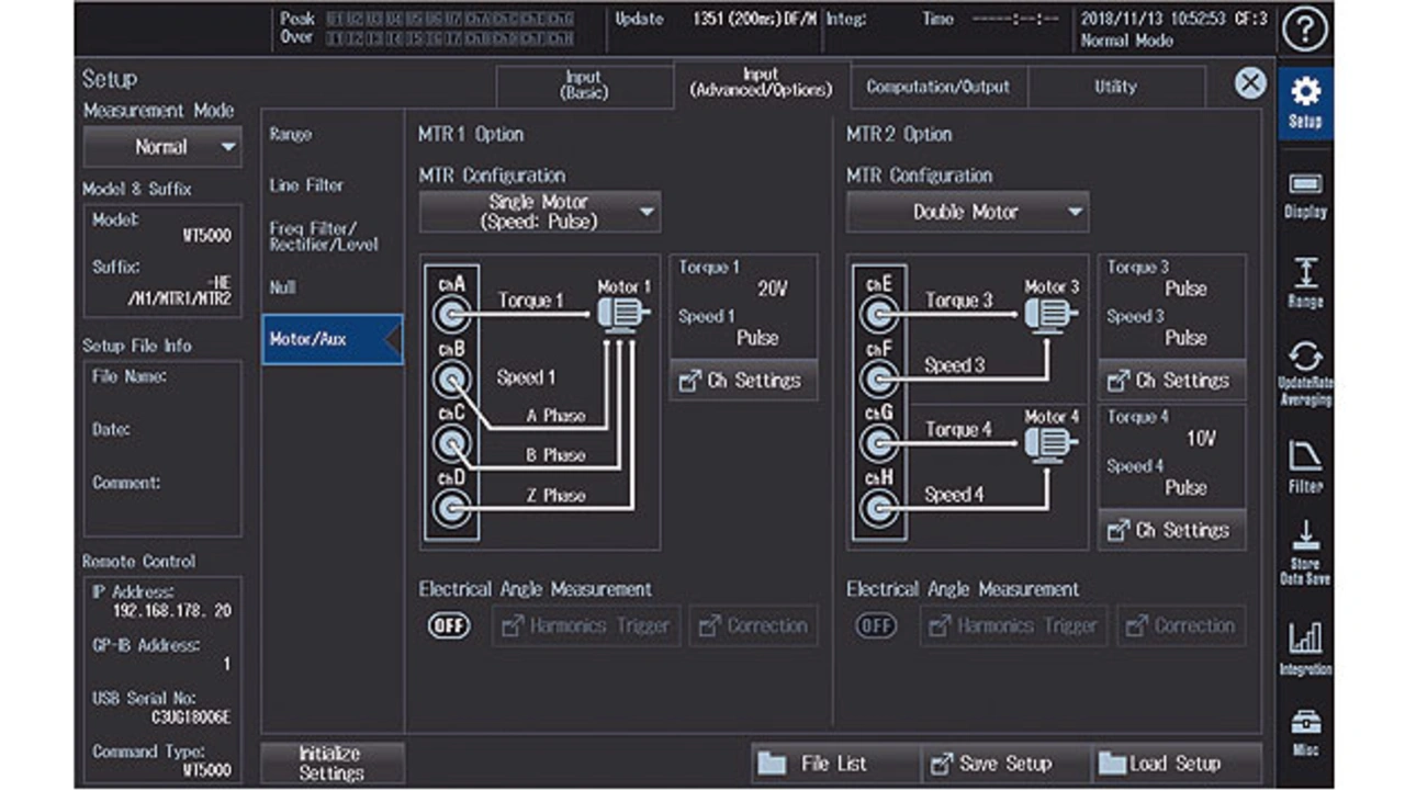 Die Konfigurationsmöglichkeiten der beiden Motor-Optionen zeigt Bild 8. Für jede Motor-Option kann »Single Motor« oder »Double Motor« ausgewählt werden. Als weitere Alternative gibt es die Einstellung »Auxiliary« (im Bild nicht ersichtlich) zur Messung von Gleichspannungen und Pulsen.