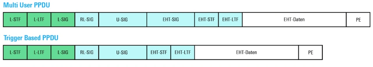 Mit 802.11be werden zwei neue Protokollformate (Protocol Packet Data Unit, PPDU) definiert (Bild 1), eines für den Multi-User-Modus (MU) und ein zweites für den Trigger-basierten Modus (TB). Neben neuen EHT-spezifischen Feldern für Steuerinformationen sind in jeder der Präambeln noch einige Legacy-Felder vorhanden, um eine Abwärtskompatibilität zu früheren 802.11-Standards zu gewährleisten. Messgeräte müssen mit den neuen PPDU-Formaten umgehen können und den gestiegenen physikalischen Anforderungen entsprechen. Nachfolgend werden je zwei Geräte für die Erzeugung und Analyse von 802.11be-Signalen vorgestellt.