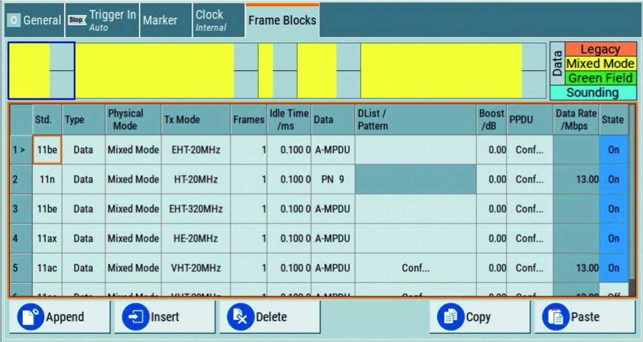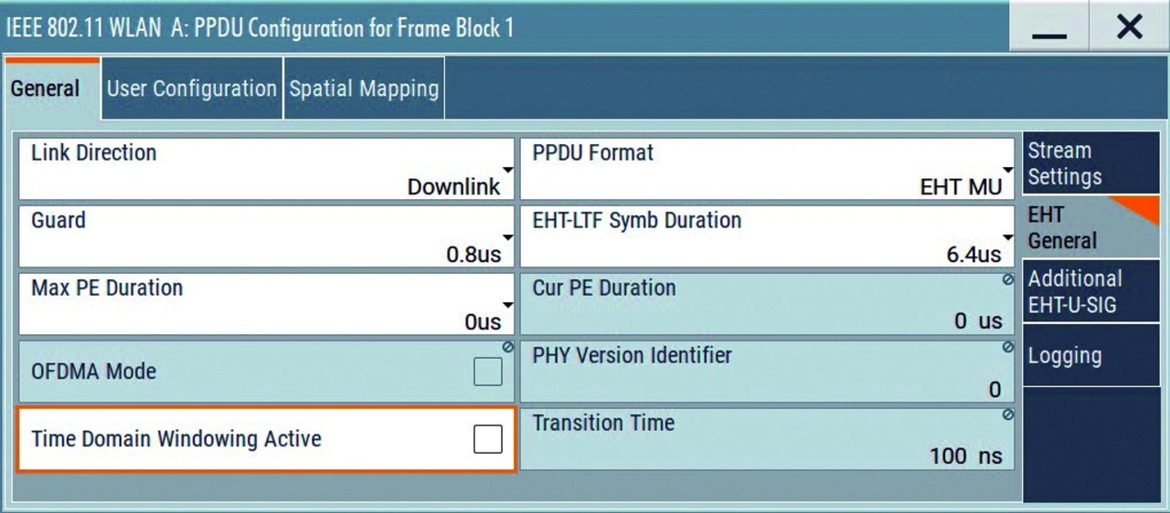 Zur Einstellung von 802.11be-Signalen sind nur wenige Schritte erforderlich. Nach der Auswahl des Übertragungsmodus im Frame Block Sequencer (Bild 2) wird die PPDU konfiguriert. 802.11be führt, wie oben erwähnt, neue PPDU-Formate ein, EHT MU und EHT TRIG, die nicht nur die Legacy-Trainings- und Signalisierungsfelder, sondern auch die für die 802.11be-Signalisierung spezifischen U-SIG- und EHT-SIG-Felder enthalten (Bild 1).