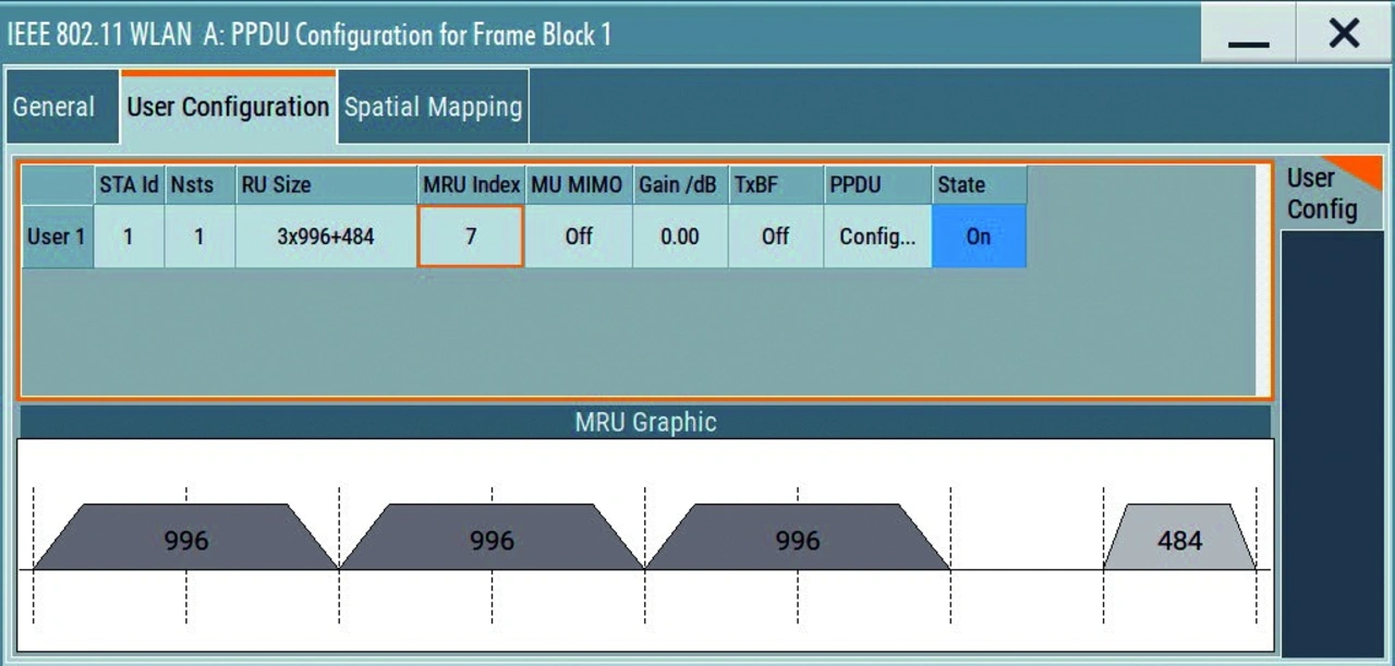 Wie vom Standard vorgesehen, ermöglicht die 802.11be-Option die Zuweisung mehrerer Ressource Units an einen einzelnen Teilnehmer. Mit der RU-Größe wird festgelegt, welche RUs, die z. B. aus 242, 484 oder 996 Teilträgern bestehen, und wie viele einem Nutzer zugewiesen werden. Der MRU-Index definiert die Position der verwendeten RUs. Dadurch werden bestimmte Frequenzbereiche innerhalb der Signalbandbreite, die von bevorrechtigten Anwendungen (z. B. Wetterradar) belegt sein können, automatisch punktiert (ausgespart) und somit nicht für Übertragungen verwendet.