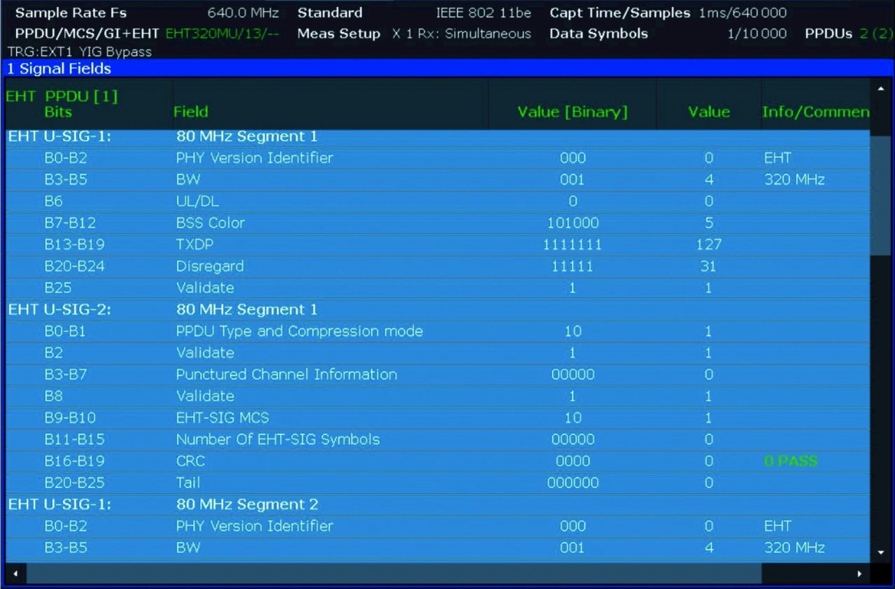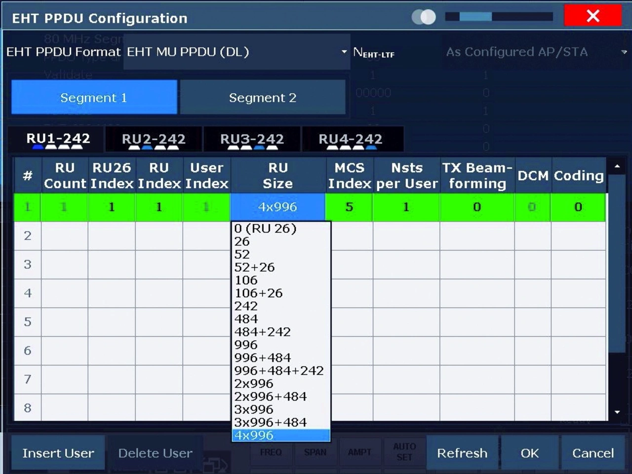 Ein Teil dieser Signalisierungsinformationen, z. B. der PHY Version Identifier, ist bereits voreingestellt. Andere Parameter wie Link Direction, PPDU-Typ, BSS Color, STA-ID, MCS-Typ oder Kanalcodierung können direkt und übersichtlich über den PPDU-Konfigurationsdialog ausgewählt werden (Bild 3). Die menügesteuerten Einstellungen zu RU Allocation und Punctured Channel werden indirekt auf EHT-SIG und U-SIG angewendet (Bild 4).