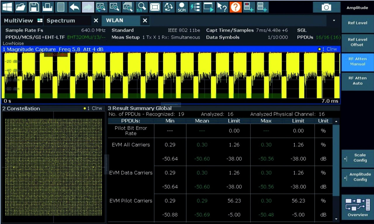 Für Anwendungen, in denen Geschwindigkeit ein Hauptkriterium ist, also etwa in Produktionslinien, gibt es Gerätealternativen: So bietet der Signal- und Spektrumanalysator der Mittelklasse R&S FSVA3007 beispielsweise mit seinem Frequenzbereich bis 7,5 GHz und ausgerüstet mit einer Analysebandbreite von 400 MHz das ideale 802.11be-Messgerät. Neben einer WLAN-Grundmessoption benötigt er eine spezielle Messapplikation für 802.11be-Signale, die funktionsgleich ist mit der bereits beschriebenen Option.