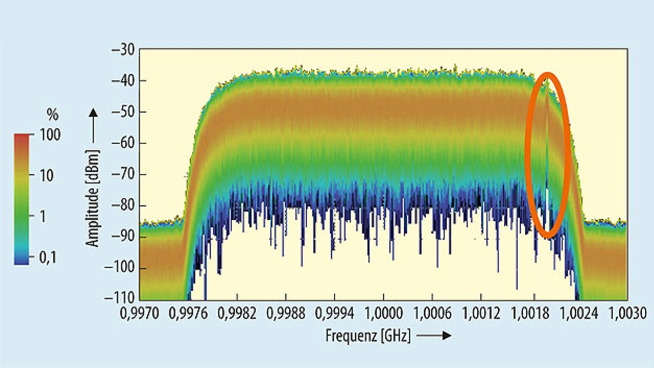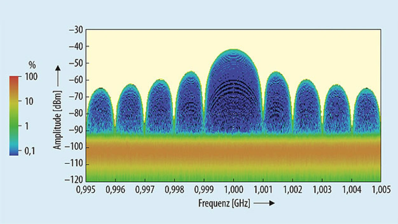 Die informativsten Bilder erhält man, wenn man eine Statistik in ein Bild umsetzt und so anzeigt, wie oft ein bestimmter Messwert auftritt (etwa eine bestimmte Amplitude an einer bestimmten Frequenz). Ein Beispiel für diese Technik ist die Dichtedarstellung. Dies ist die Darstellung eines Spektrums, in der die Häufigkeit des Auftretens eines bestimmten Werts in der Farbe oder der Helligkeit codiert ist. Eine Nachleuchtfunktion lässt alte Daten mit der Zeit verblassen und lenkt so die Aufmerksamkeit des Anwenders auf neue Ereignisse (Bild 2).