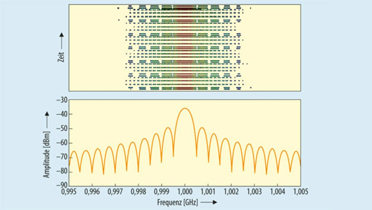 Mit einem Spektrogramm kann man einen kompletten Impulszug über eine längere Zeitdauer darstellen. Zusätzlich kann man eine Einzelfrequenz auswählen (also eine einzelne horizontale Linie des Spektrogramms), die dann als separate Messkurve angezeigt wird (Bild 4). Solche Messungen sind mit einem Spektrumanalysator, der nach dem Wobbelverfahren arbeitet, nicht möglich.