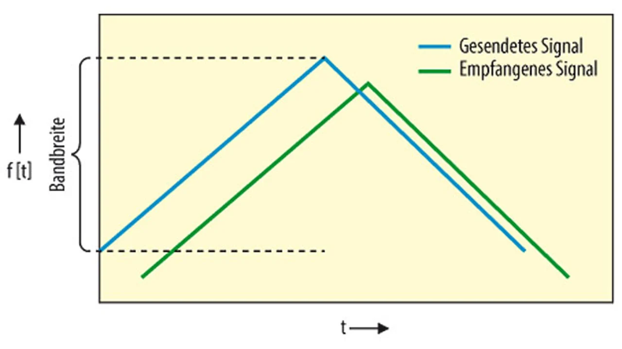 Die Entfernung von detektierten Objekten und deren Geschwindigkeit werden durch den Frequenzunterschied zwischen gesendetem und empfangenem Signal berechnet. Die Entfernungsauflösung ist durch die Bandbreite der Chirps gegeben. Mit 500 MHz Bandbreite wird eine Entfernungsauflösung von 30 cm erreicht. Bild 3 zeigt exemplarisch ein „Linear Frequency Modulated Continuous Wave Radar“ mit einem Upchirp (Abschnitt steigender Frequenz) und einem Downchirp (Abschnitt fallender Frequenz).