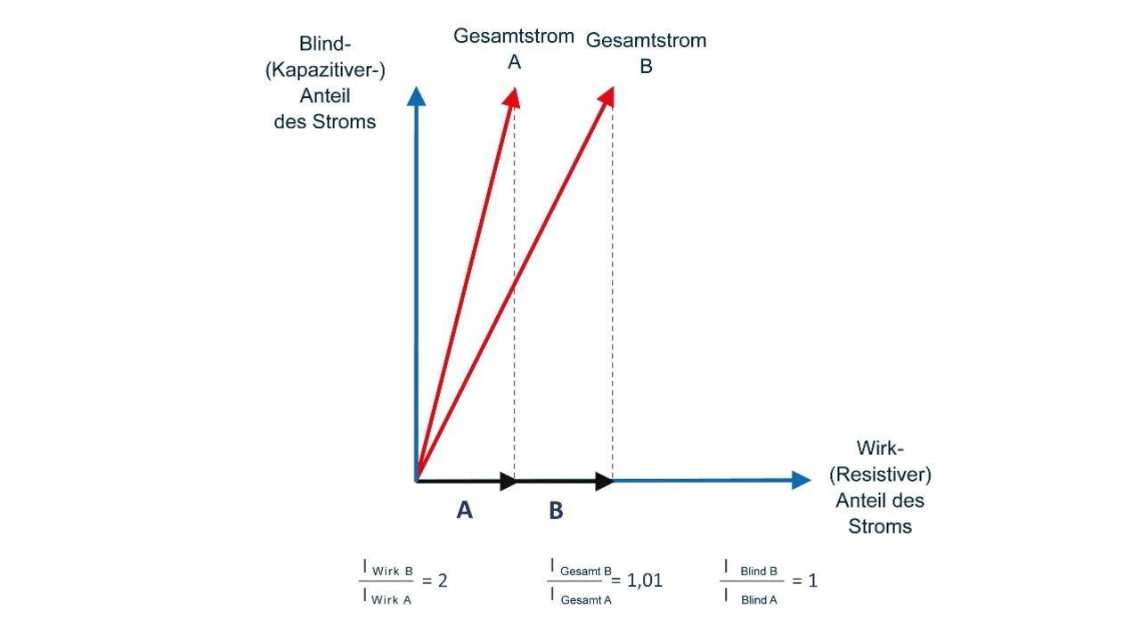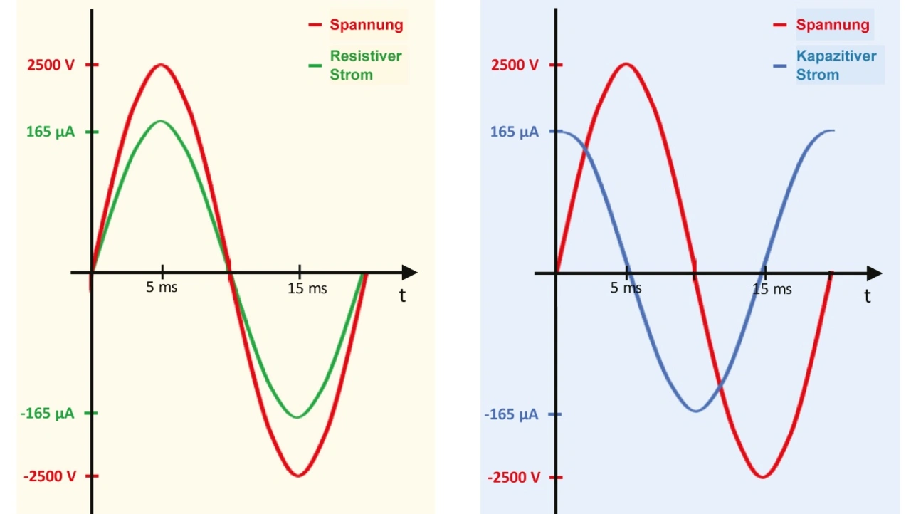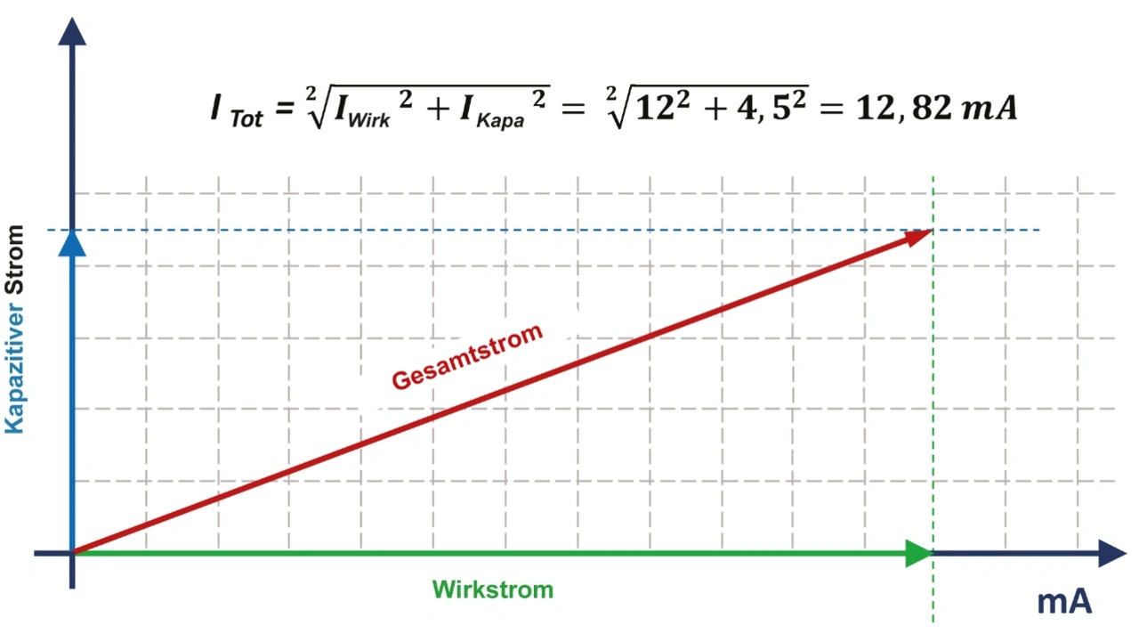 Der gemessene Gesamtstrom ist das Ergebnis der Vektorsumme der beiden Ströme: Resistiver Strom, genannt Wirkstrom und kapazitiver Strom, genannt Blindstrom. Das Anlegen einer AC-Durchschlagfestigkeitsprüfspannung an ein kapazitives Element wie ein Kabel erzeugt einen Blindstrom, der um 90° phasenverschoben zur angelegten Spannung ist. Der ohmsche Ableitstrom ist in Phase mit der Spannung.