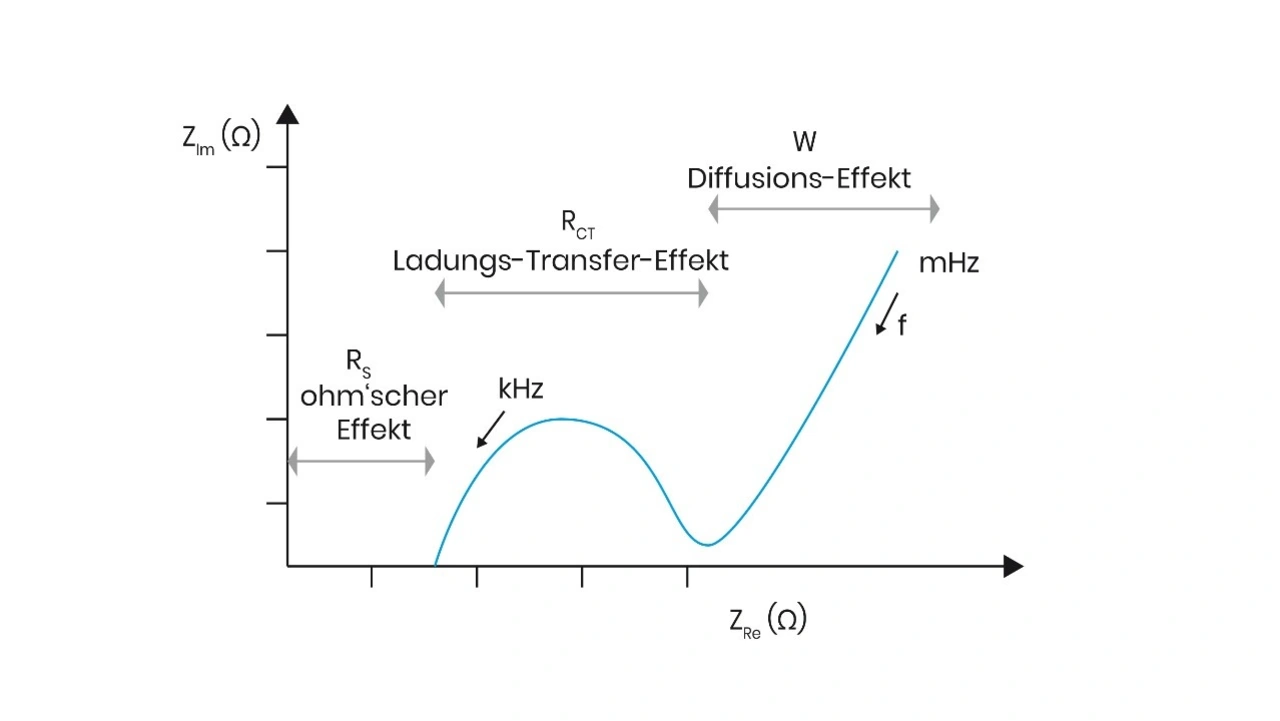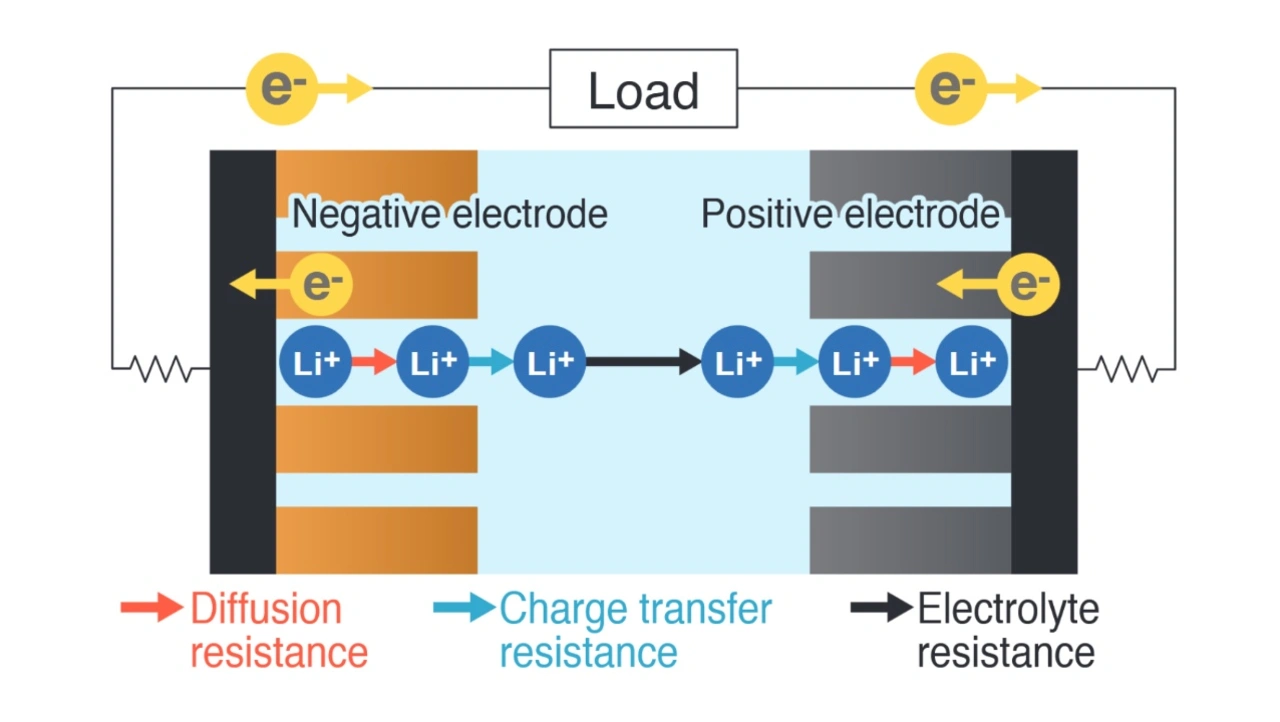 Im Inneren einer Batterie trennt eine poröse Platte (Separator) eine chemische Redox-Reaktion (Reduktion-Oxidation) physikalisch in zwei Halbzellenreaktionen: An jeder Elektrode findet eine Reduktions- oder Oxidationsreaktion mit den chemischen Verbindungen im Elektrolytlösungsmittel statt. Jede dieser Reaktionen erzeugt ein Potenzial. Die maximale Potenzialdifferenz zwischen den Halbzellen ist die elektromotorische Kraft (EMK, englisch EMF für Electromotive Force) der Batterie. Diese kann als Leerlaufspannung (OCV/Open Circuit Voltage) gemessen werden. In Sekundärbatterien (d. h. Akku/wiederaufladbar) können diese Reaktionen umgekehrt werden. Dazu wird ein Potenzial angelegt, das größer ist als die Batterie-EMK und eine entgegengesetzte Polarität aufweist. Sind die beiden Elektroden durch eine externe Last verbunden, treibt die EMK die Elektronen von der Anode durch die Last zur Kathode. Gleichzeitig werden positiv geladene Ionen im Elektrolyt durch die Flüssigkeit und den Separator mobilisiert, um die Ladungsdiskrepanz zu stabilisieren. Die Geschwindigkeit, mit der die positiv geladenen Ionen und Elektronen fließen, bestimmt den elektrischen Strom. Im Idealfall würde ein unendlicher Strom bedeuten, dass sich diese geladenen Teilchen unendlich schnell von Elektrode zu Elektrode bewegen. In der Realität ist das natürlich nicht möglich. Hier wirkt immer eine Mindestimpedanz. Im Laufe der Zeit treten in der Batterie zudem physikalisch-chemische Veränderungen auf, die die zugrunde liegenden Mechanismen verlangsamen. Dies führt zu einer Erhöhung der Impedanz der Batterie.