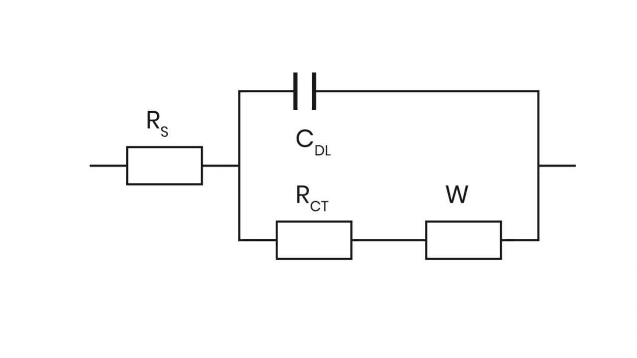 Der mit RS bezeichnete Widerstand (auch Rel, Elektrolytwiderstand) wird durch die Bewegung der ionischen Verbindungen im Elektrolyten bestimmt. RCT ist der Ladungstransferwiderstand/Ladungsübergangswiderstand, der sich aus der Übertragung von Elektronen während der Redox-Reaktion ergibt. Der Parallel-Kondensator mit der Bezeichnung CDL symbolisiert die elektrische Doppelschichtkapazität, ein Doppelschicht-Phänomen, das an der Oberfläche der Elektrode auftritt, wenn diese dem Elektrolyten ausgesetzt ist. W (Diffusions-Widerstand) ist das Phasenelement der Warburg-Konstante, die zur Beschreibung der Diffusion chemischer Substanzen dient.