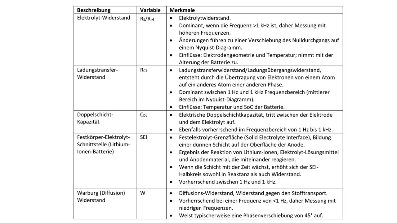 Möglicherweise ist in einem Nyquist-Diagramm auch mehr als einen Halbkreis zu sehen. Das kann vorkommen, weil zusätzliche chemische Reaktionen in der Batterie stattfinden. Ein gängiges Beispiel hierfür sind Lithium-Batterien: Neben der Redox-Reaktion findet hier eine weitere chemische Reaktion statt, an der die Lithium-Ionen, der Elektrolyt und die Anode beteiligt sind. Während des Ladens wandern die Lithium-Ionen durch den Elektrolyt zur Anode, wo sie eingelagert werden. Ein gewisser Prozentsatz der Ionen und des Elektrolyts vermischt sich jedoch mit der Anode und bildet die Festelektrolyt-Grenzfläche (SEI). Tabelle 1 fasst die kinetischen und Ladungsübertragungsmechanismen zusammen, die an der elektrochemischen Reaktion einer Batterie beteiligt sind.