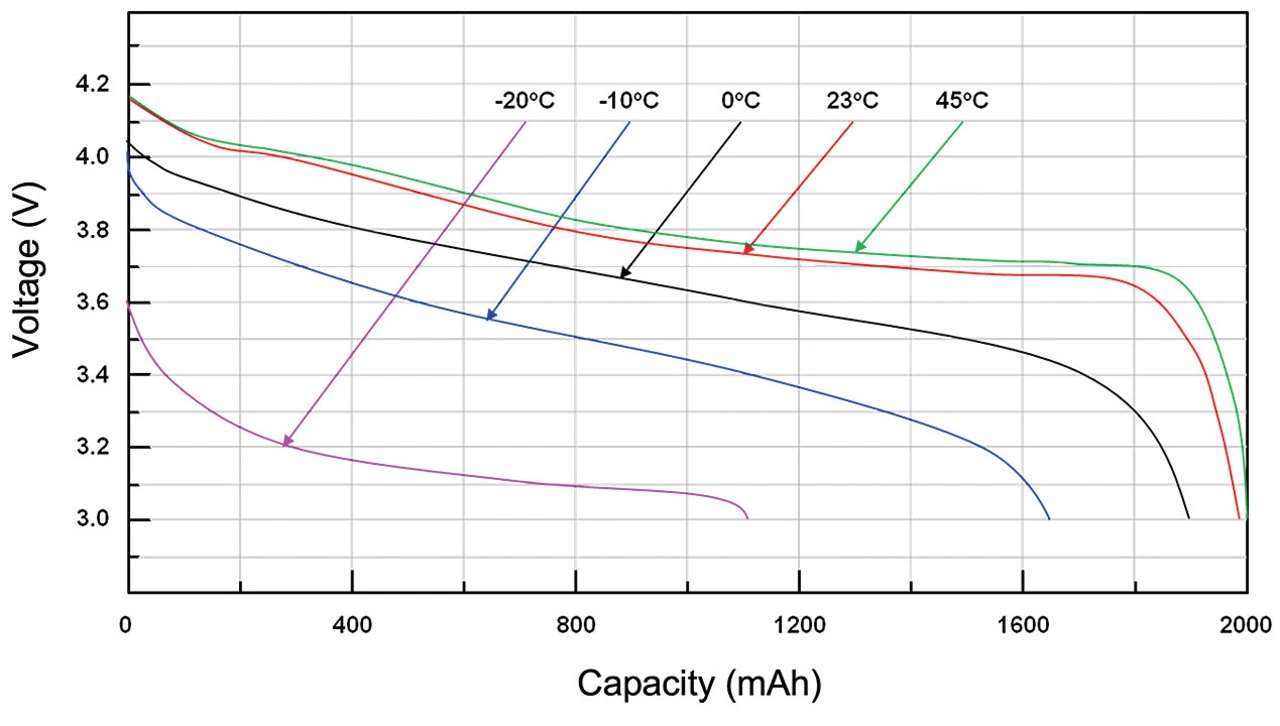 Neben der unterschiedlichen Stromaufnahme variiert auch die Batteriekapazität je nach durchschnittlichem Entladestrom und Nutzungsmuster. In Bild 1 ist eine beträchtliche Schwankung der Entladekapazität einer Alkalizelle in Abhängigkeit vom Entladestrom zu erkennen. Ebenso kann sich die Temperatur auf die Batterielaufzeit auswirken (Bild 2), was ein weiterer wichtiger Aspekt ist. Daneben gibt es noch weitere Faktoren, die dazu führen können, dass die berechnete Batterielaufzeit länger ist als bei der realen Nutzung, unter anderem: