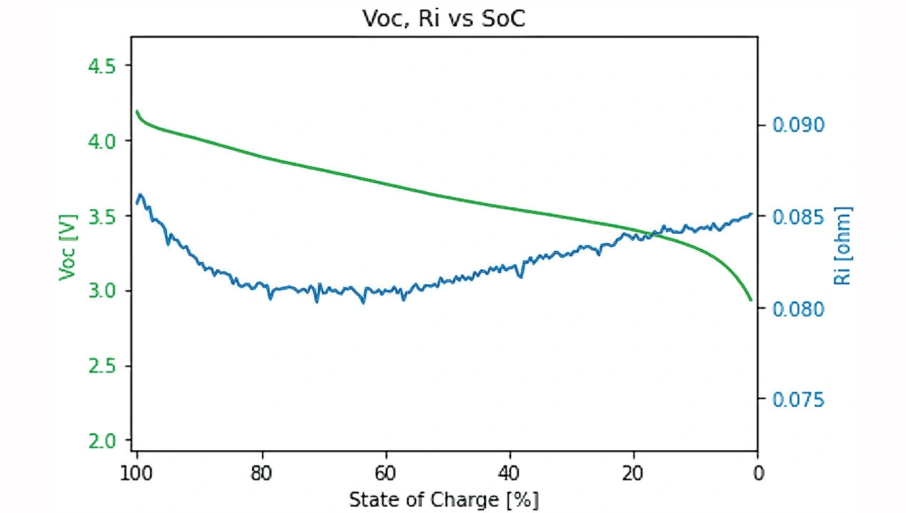Ein Batterieemulator wie der Keysight Battery Emulator E36731A arbeitet in mehreren Schritten. Der erste Schritt ist das Laden eines Batterieprofils. Bei diesem Profil handelt es sich um die Daten eines Diagramms der Batteriespannung und des Innenwiderstands im Verhältnis zum SoC, wie in Bild 3 dargestellt. Ein Batterieprofil wird mithilfe einer Batteriemodellierungssoftware erstellt, oder indem man ein Profil vom Batteriehersteller übernimmt.