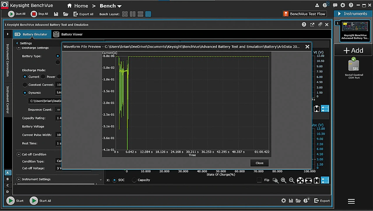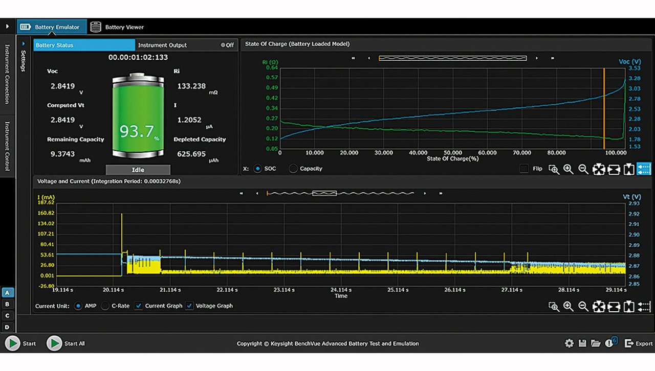 Der nächste Emulationsschritt ist die Auswahl des Start-SoC und der Abschaltspannung. Das Gerät wird an den Emulator angeschlossen und die Batterieemulation gestartet. Batterieemulatoren messen kontinuierlich den Lade- oder Entladestrom und berechnen dynamisch die emulierte SoC (Bild 5). Der Emulator ändert seinen Ausgang (Spannung und Widerstand) kontinuierlich auf der Grundlage des SoC, um dem geladenen Batterieprofil zu entsprechen. Der Test endet, wenn der Emulator die Abschaltspannung erreicht.