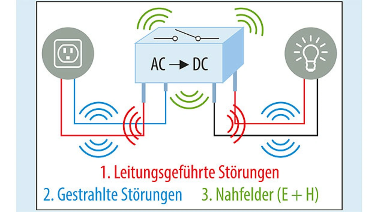 EMV umfasst verschiedene Aspekte und wird im folgenden Beitrag als Oberbegriff verwendet. Dazu gehören leitungsgeführte Störungen (Conducted Emissions), gestrahlte Störungen (Radiated Emissions) sowie Störfestigkeit (Burst, Surge, ESD usw.).