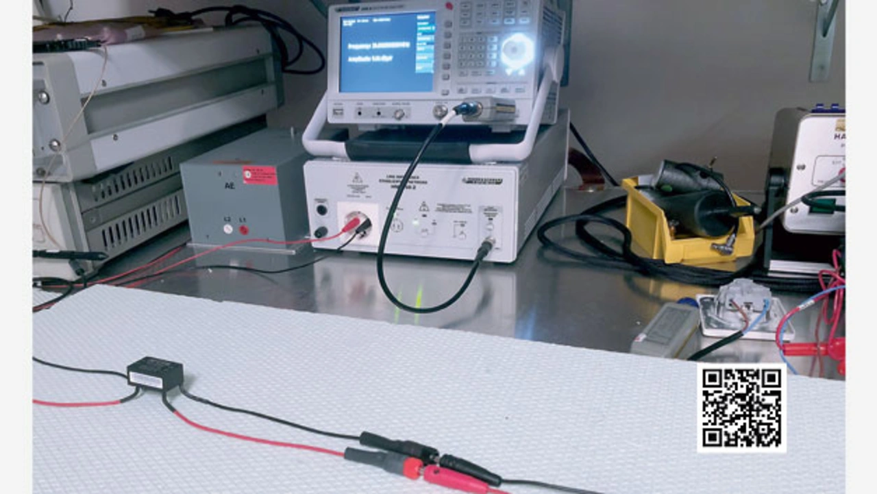 Ein (nicht ganz normkonformer) Precompliance-Messaufbau ist in Bild 2 zu sehen: Im Vordergrund ist links der Prüfling (DUT), ein 3-W-Leistungsmodul, sowie rechts die angeschlossene Last, ein 3,3-Ω-Widerstand, zu sehen. Die Versorgungsleitungen, die von links zum Prüfling führen, sind im Hintergrund an eine Netznachbildung (HM 6050-2 LISN) angeschlossen. Die Aufgabe des LISN (Line Impedance Stabilization Network) besteht im Wesentlichen aus drei Aspekten: