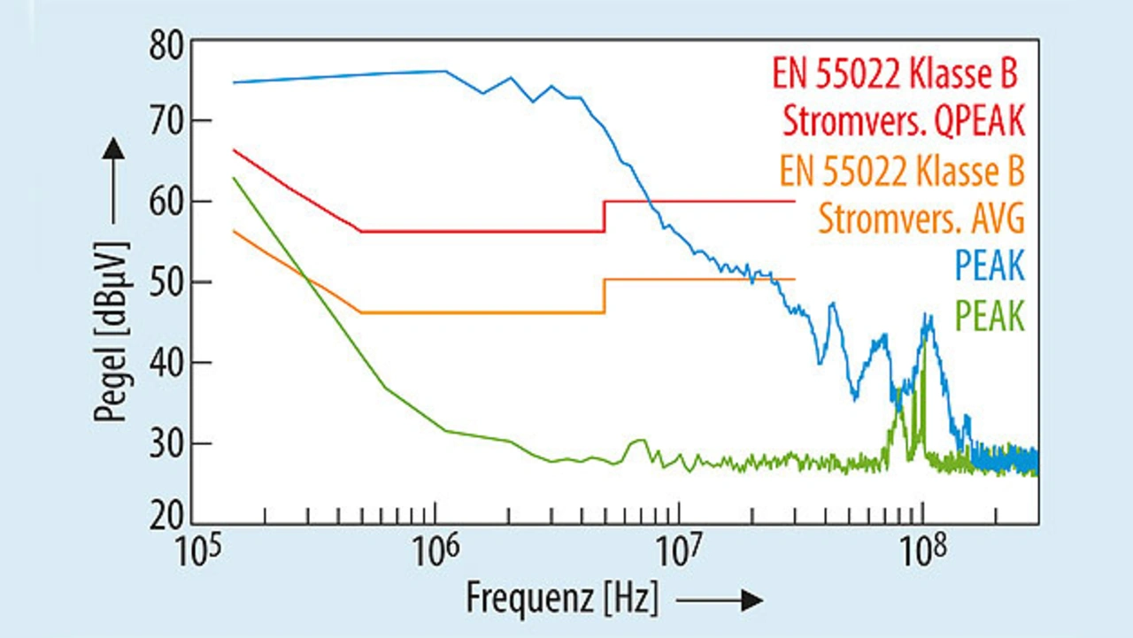 Je höher die Frequenzen werden, desto bedeutsamer wird der zuletzt genannte Punkt, da der Antennenwirkungsgrad der Ausgangsleitungen (oder -Leiterbahnen) mit zunehmender Frequenz immer besser und damit das EMV-Problem immer größer wird. Aus diesem Grund wurde bei der Messung auch ein deutlich größerer Frequenzbereich (bis 300 MHz) untersucht, als dies bei der »klassischen« Messung geleiteter Störungen auf dem Netzkabel üblich ist.