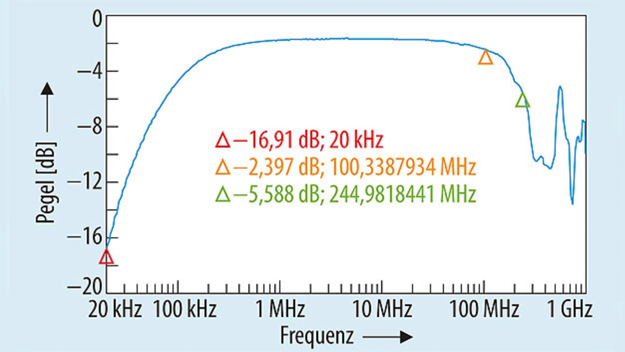 In Bild 5 ist die Einfügungsdämpfung eines kleinen Selbstbau-LISN dargestellt, wobei der charakteristische Verlauf auch bei kommerziellen Geräten sehr ähnlich aussieht: Durch die kapazitive Auskopplung des Messsignals ist bei sehr niedrigen Frequenzen eine entsprechend hohe Einfügungsdämpfung zu beobachten, die dann mit zunehmender Frequenz nachlässt. Oberhalb etwa 100 kHz bis etwa 200 MHz liegt die Einfügungsdämpfung bei nur einigen wenigen dB, um dann zu höheren Frequenzen wieder größer zu werden. Um etwa 400 MHz liegt die Dämpfung bei –10 dB, bei knapp 800 MHz sind es etwa –13 dB. Für die vorgestellten Precompliance-Messungen könnte das Selbstbau-LISN auch ohne Korrekturwerte bis rund 200 MHz eingesetzt werden, ohne dabei erhebliche Messfehler zu verursachen.