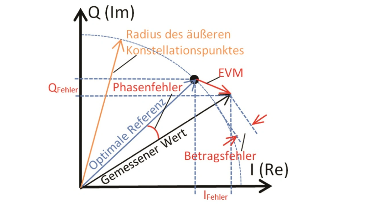 Der Referenzwert der Prozentberechnung bei der EVM ist der Radius des äußersten Konstellationspunktes. Der EVM-Wert lässt sich als Effektivwert (RMS, unter Betrachtung aller Symbole) oder als Spitzenwert (peak, der größten Abweichung) messen. Ein verrauschtes Signal würde zu einem höheren EVM-Wert führen, sodass die Wahrscheinlichkeit steigt, dass der Empfänger das Symbol falsch erkennt. Abhängig davon, wie die Senderspezifikation aussieht, muss der gemessene EVM-Wert direkt am Sender kleiner sein. In Bild 3 ist außerdem der Betrags- und Phasenfehler dargestellt. Beide Messwerte sind ebenfalls in der Fehlermessung zu sehen.