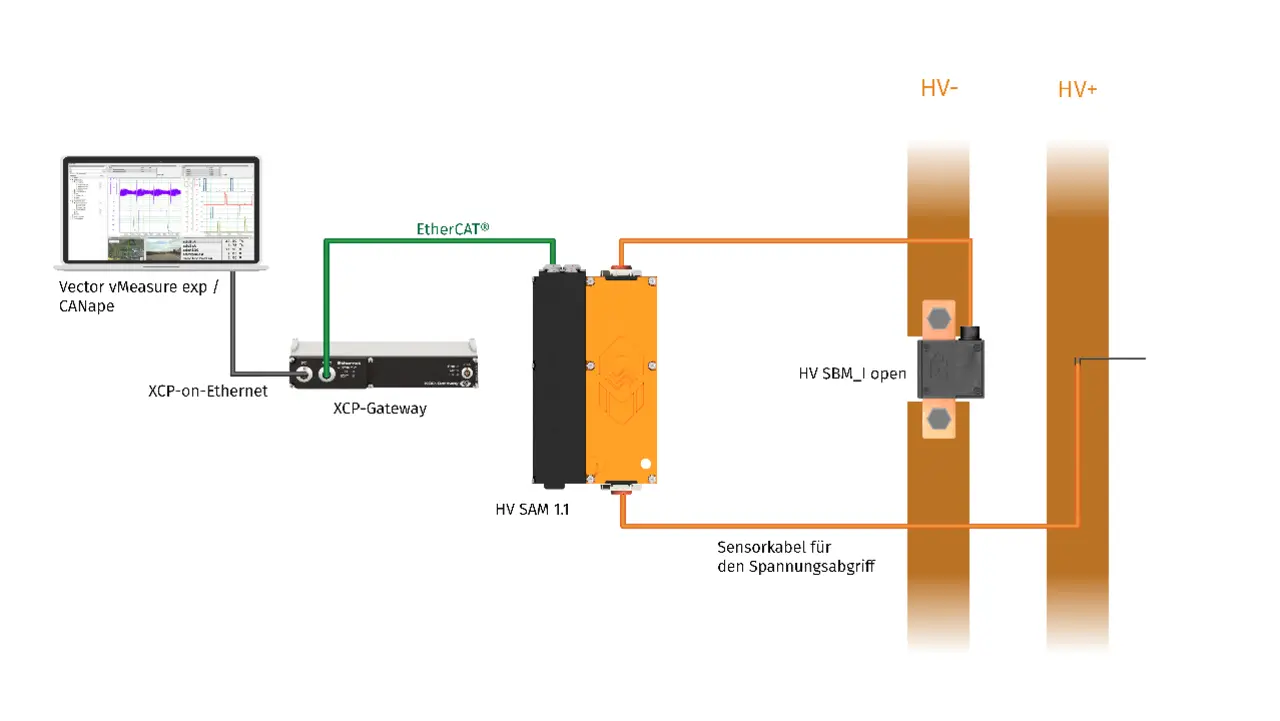 Das Sensorkabel wird an ein Messmodul HV SAM (SAM – Split-Acquisition-Modul) angeschlossen. Das HV SAM kann an einer geeigneten Stelle außerhalb des Hochvolt-Bauraumes installiert werden. Dieses Messmodul führt die galvanische Trennung, Filterung und AD Wandlung, Online-Verrechnung und die Protokollumsetzung durch.
