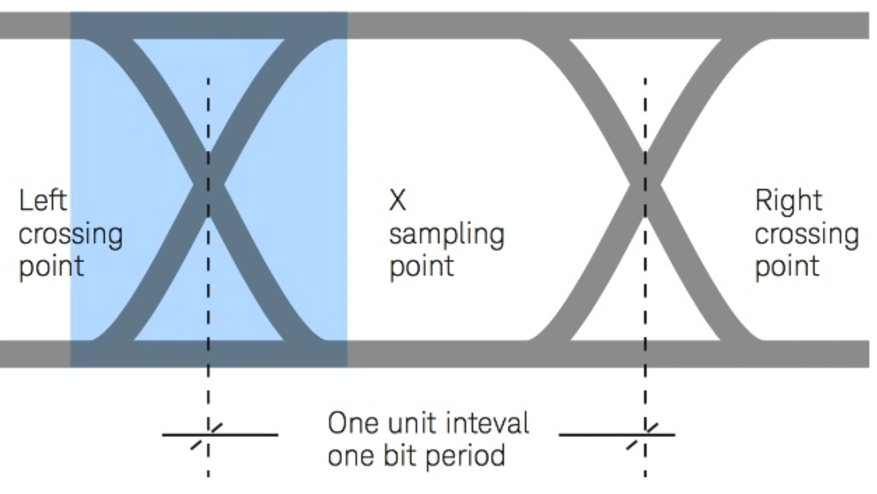 Dieses idealisierte Augendiagramm zeigt sehr glatte und symmetrische Über-gänge an den beiden Kreuzungspunkten. In der Mitte eines großen, weit geöffneten „Auges” bezeichnet ein „x“ den idealen Zeitpunkt für das Abtasten eines Bits. An diesem Zeitpunkt sollte sich das Signal beruhigt haben und stabil auf High oder Low stehen. Bei einer Erfassung an diesem Zeitpunkt ist die Gefahr eines Bitfehlers am geringsten.