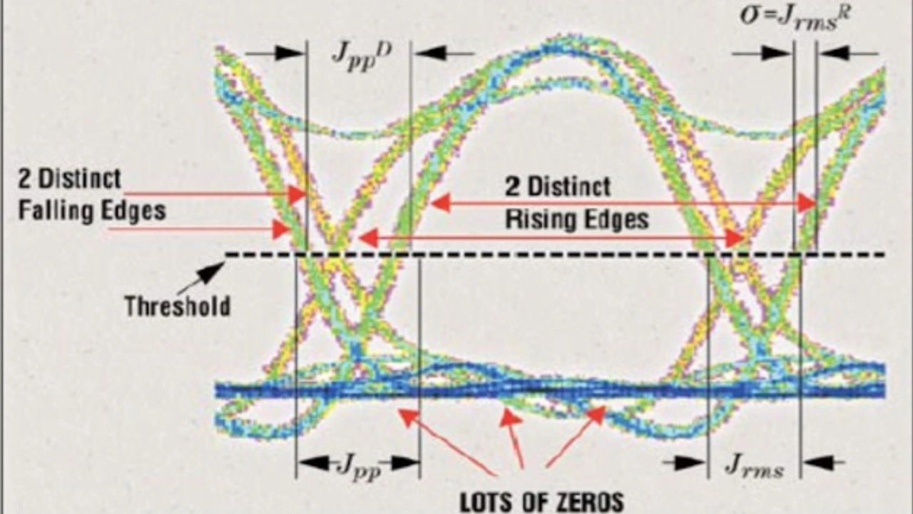 In diesem realen Augendiagramm variiert die Amplitude der Grundlinie deutlich weniger als die Dachlinie, das Signal enthält also mehr Nullen als Einsen. Die Grundlinie besteht aus vier einzelnen Trajektorien, also folgen vermutlich vier Nullen aufeinander. Die Dachlinie zeigt maximal zwei Trajektorien, daher kann das Signal maximal zwei aufeinanderfolgende Einsen enthalten. Das Signal zeigt zwei unterschiedliche ansteigende und fallende Flanken, das zeigt, dass das Signal deterministischen Jitter enthält. Schließlich ist der Abstand der fallenden Flanken voneinander größer als der Abstand der ansteigenden Flanken, einige der Schnittpunkte schneiden unterhalb des Schwellenwerts. Das belegt ein verschobenes Tastverhältnis, die Nullen sind länger als die Einsen.