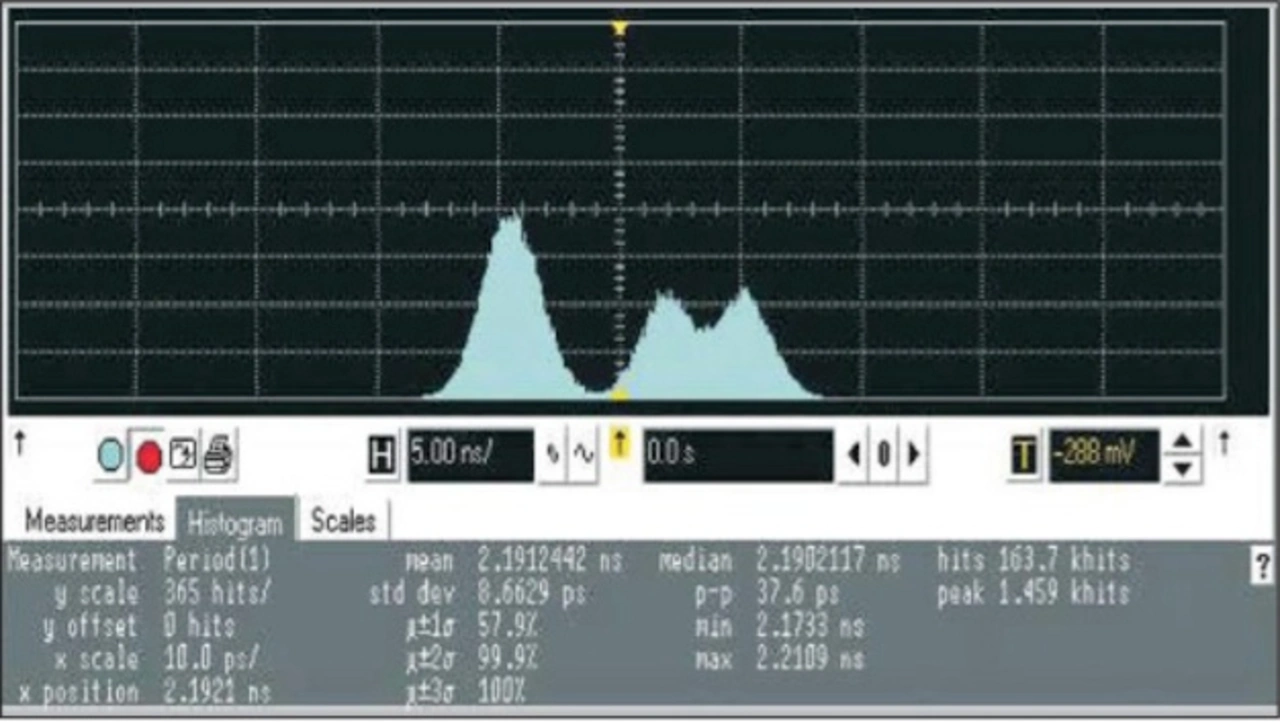 Bei der Jitteranalyse kann man Signalparameter wie etwa Anstiegs- oder Abfallzeit, Periodendauer oder Tastverhältnis in Form eines Histogramms darstellen lassen und darauf dann beispielsweise mehrere Maxima erkennen, die etwa vom übertragenen Bitmuster abhängen (siehe dazu Abbildung 3). Histo gramme liefern auch Datensätze für Routinen zur Jittertrennung. Das wird für verschiedene digitale Busstandards gebraucht. Das Histogramm in Abb. 3 zeigt periodischen Jitter auf einem Taktsignal. Auf der linken Seite sieht das Histogramm aus wie eine Gauss'sche Normalverteilung. Auf der rechten Seite zeigt die Kurve aber zwei Gipfel. Das Signal enthält also offenbar Frequenzanteile auf der 2. und 4. Harmonischen, die Jitter verursachen.
