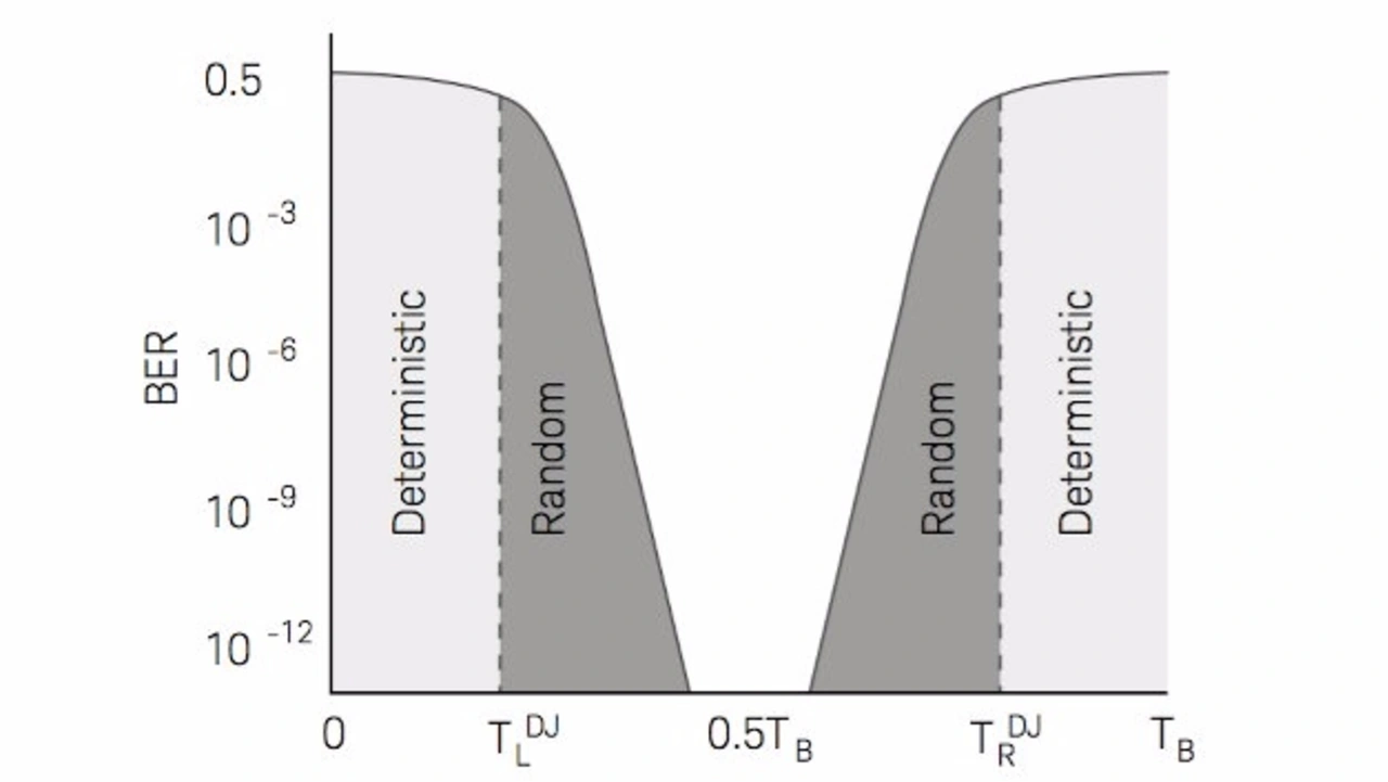 Liegt der der Abtastzeitpunkt im Bereich der Flanken, beträgt die BER 0,5. Das bedeutet: Die Wahrscheinlichkeit, dass die Übertragung eines Bits funk tio niert oder fehlschlägt, ist gleich groß. Die Messkurve ist in diesen Bereichen recht eben. Diese Bereiche sind dominiert vom deterministischen Jitter. Wenn der Abtastzeitpunkt sich von den Flanken wegbewegt, sinkt die BER schnell. In diesen Bereichen überwiegt der zufällige Jitter, also wird die BER hauptsächlich von der Teilsumme des zufälligen Jitters bestimmt. Die Badewannenkurve verdeutlicht, dass der günstigste Zeitpunkt, ein Symbol abzutasten, genau in der Mitte zwischen dem Beginn und dem Ende seiner Übertragungszeit liegt.